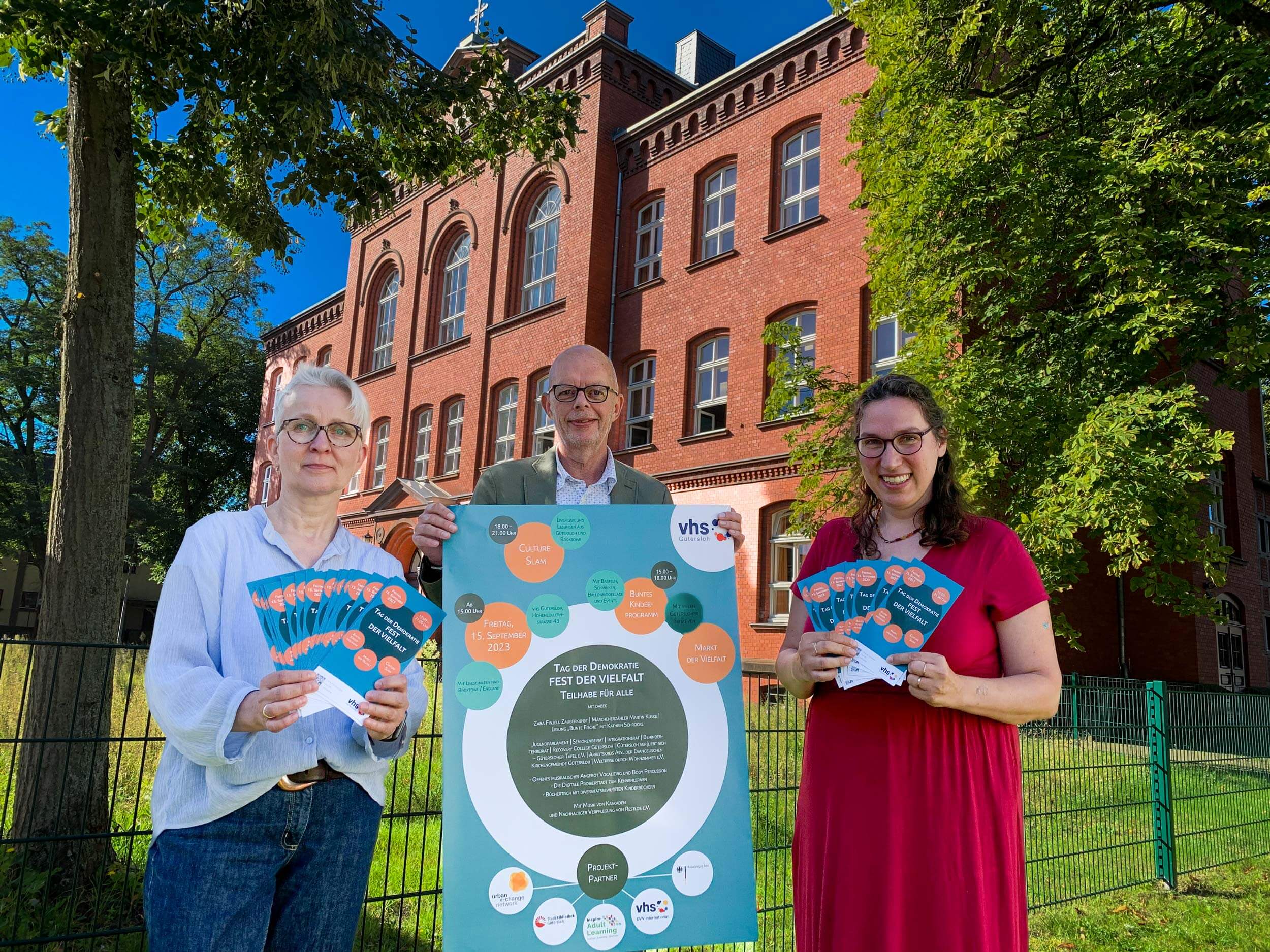 Sehen dem ersten „Fest der Vielfalt“ am 15. September in der Volkshochschule Gütersloh an der Hohenzollernstraße mit Spannung und Vorfreude entgegen: (von links) Anja Krokowski, stellvertretende Leiterin der Stadtbibliothek Gütersloh, VHS-Leiter Dr. Elmar Schnücker und die stellvertretende VHS-Leiterin Dr. Mariella Gronenthal. Foto: Stadt Gütersloh