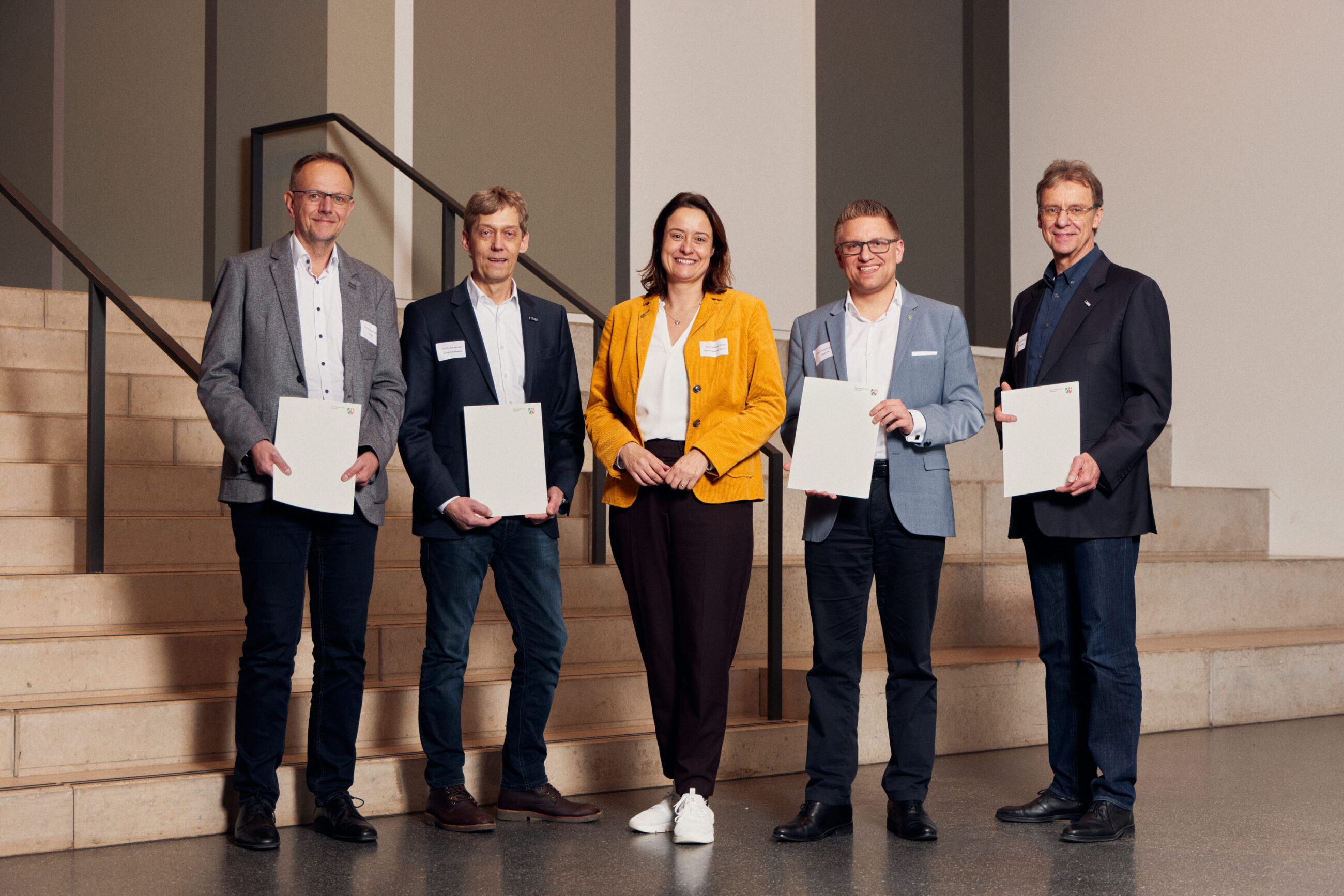 Die Regierungspräsidentin überreichte die Förderbescheide an die vier Kooperationspartner (v.l.n.r.): Prof. Dr. Rainer Rasche von der TH OWL, Prof. Dr. Rolf Naumann von der HSBI (Projektleitung), Regierungspräsidentin Anna Katharin Bölling, Robin Rieksneuwöhner als Bürgermeister der Stadt Verl, Prof. Dr. Ulrich Rückert, Prorektor für Digitalisierung und Dateninfrastruktur an der Universität Bielefeld. (Foto: P. Pollmeier /HSBI)