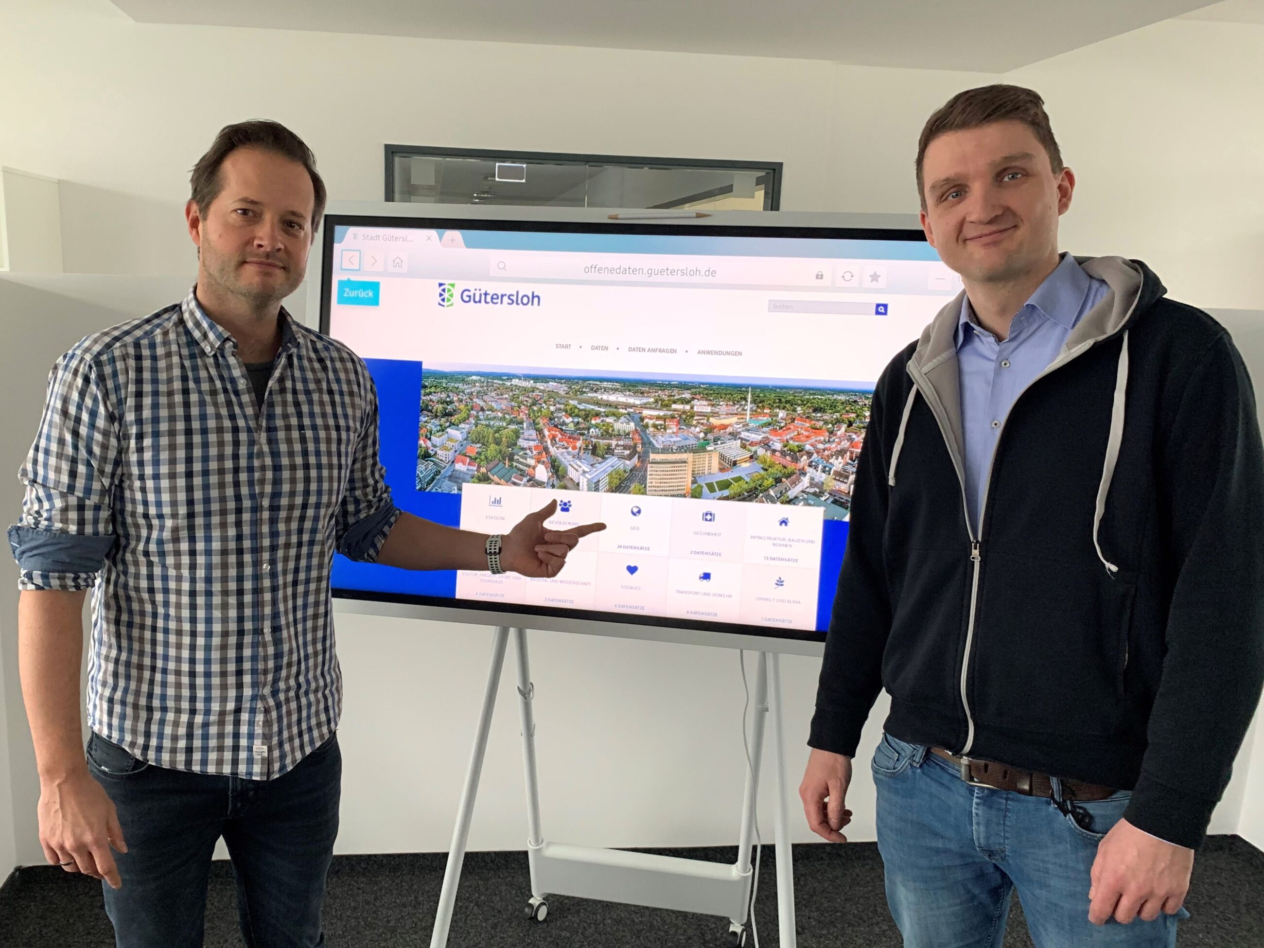 Präsentieren das neue Open Data Portal der Stadt Gütersloh, das im Internet unter offenedaten.guetersloh.de erreichbar ist: Thorsten Schmidthuis, Leiter des Fachbereichs Digitalisierung und Geoinformation (links), und Claudius Gouders, Abteilungsleiter Geoinformation.