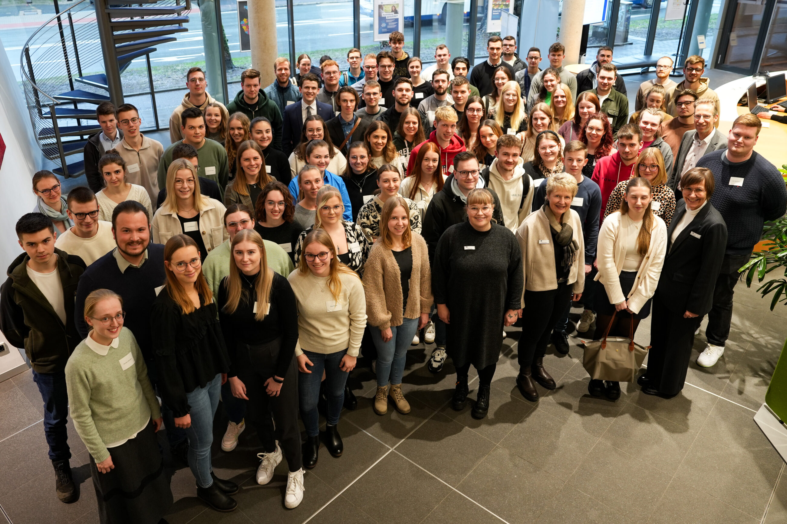 Ute Horstkötter-Starke, IHK-Geschäftsführerin Berufliche Bildung (erste Reihe rechts) und Dietmar Niedziella, IHK-Referatsleiter Höhere Berufsbildung/Fachkräftesicherung (dritte Reihe rechts) gratulierten den erfolgreichen Ausbildungsabsolventinnen und -absolventen zur Aufnahme in den Kreis der Weiterbildungsstipendiatinnen und -stipendiaten. Foto: IHK Ostwestfalen/Tilo Sommer