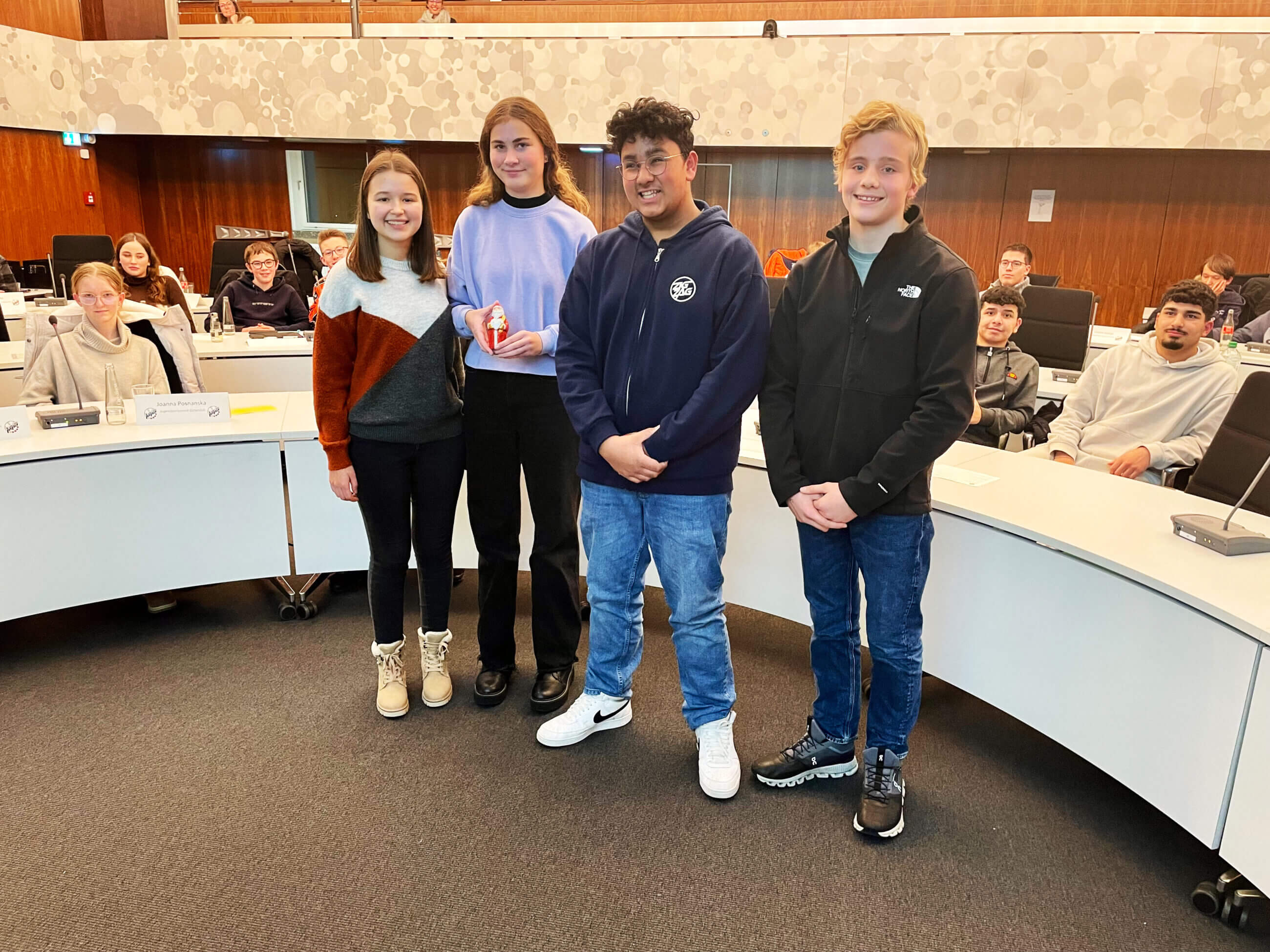 Nachdem sich alle Kandidatinnen und Kandidaten vorgestellt hatten, wurde gewählt. Nach Auszählung aller Stimmen stand fest: Das neue Sprecher-Team des 12. JuPas bilden Diana Gregova und Carlo Schmidt als Sprecherin und Sprecher sowie Leni Blanke und Nick Baretti als stellvertretende Sprecherin und stellvertretender Sprecher.