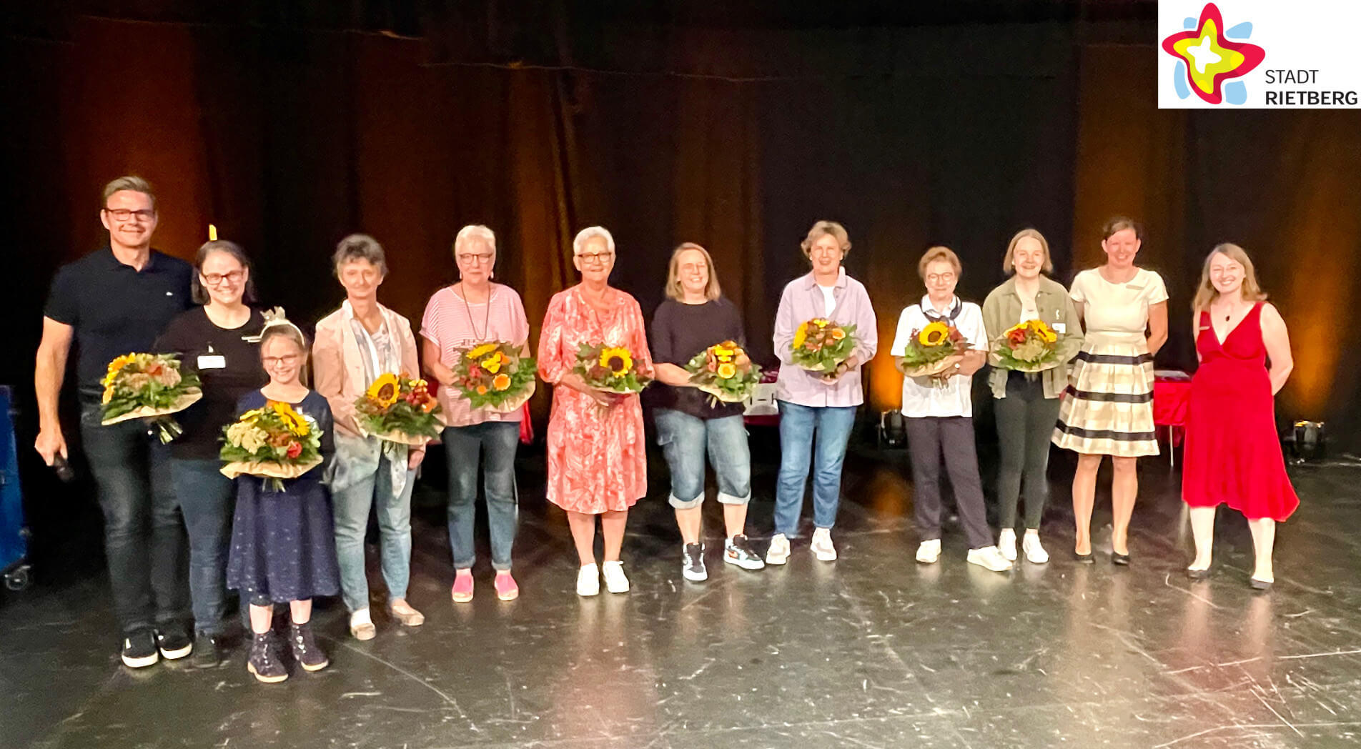 Bildzeilen: Bürgermeister Andreas Sunder (links) bedankte sich bei den ehrenamtlichen Lesepatinnen Miriam Hanke (mit Tochter Johanna), Gabriele Reese, Ingrid Beyer, Sabine Kanthak, Jessica Kramer, Christa Honerlage, Christa Hampel-Rieländer und Madlen Schall sowie Julia Bröckling und Jennifer Bader (von links) von der Stadtbibliothek. Foto: Stadt Rietberg.