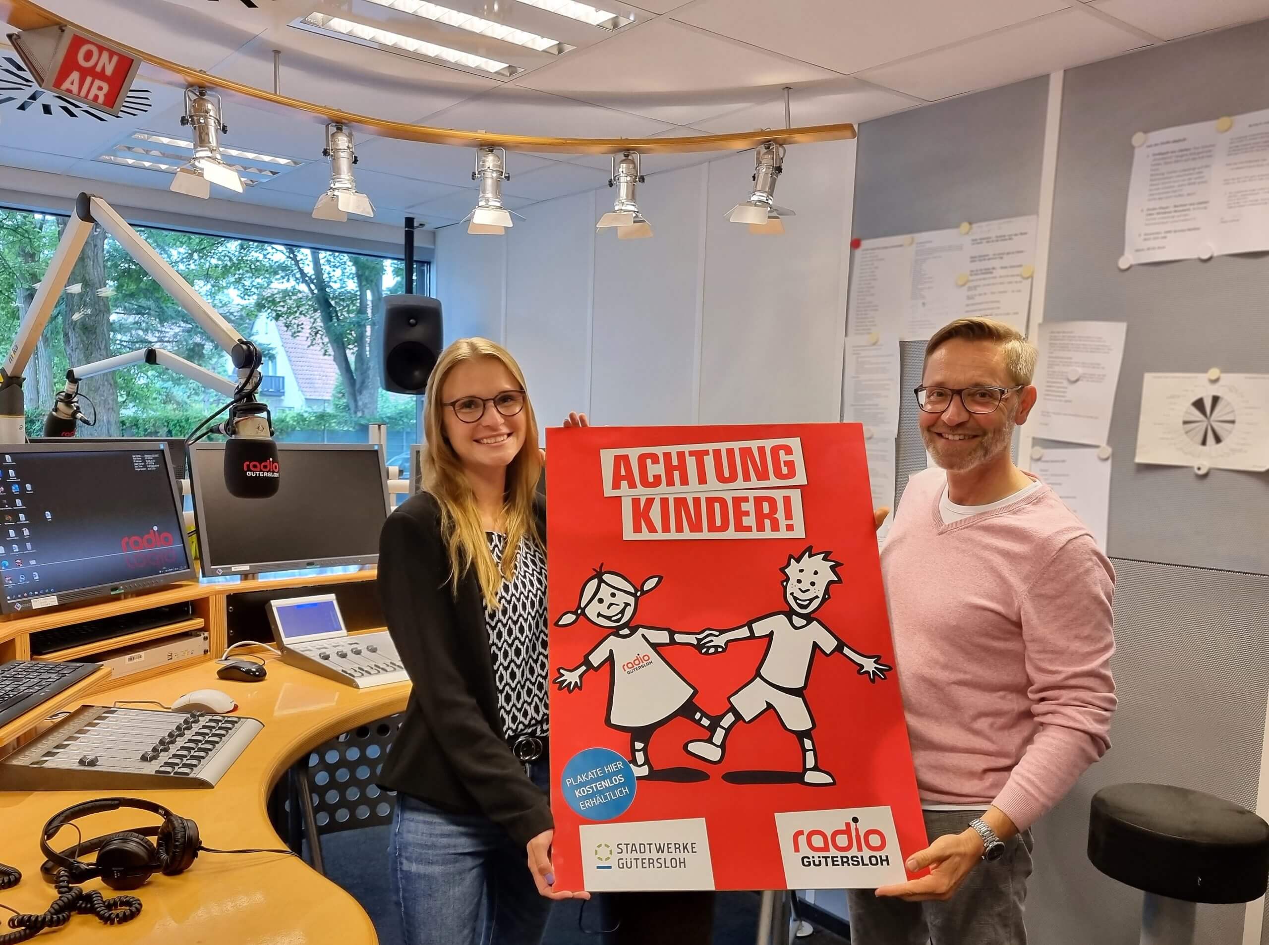 Foto: Stadtwerke Gütersloh – Gemeinsam für mehr Sicherheit im Straßenverkehr: Stadtwerke-Sprecherin Sina Schäffer (l.) und Radio Gütersloh-Chefredakteur Carsten Schoßmeier freuen sich darauf, viele Plakate der gemeinsamen Aktion „Achtung Kinder“ zu verteilen.