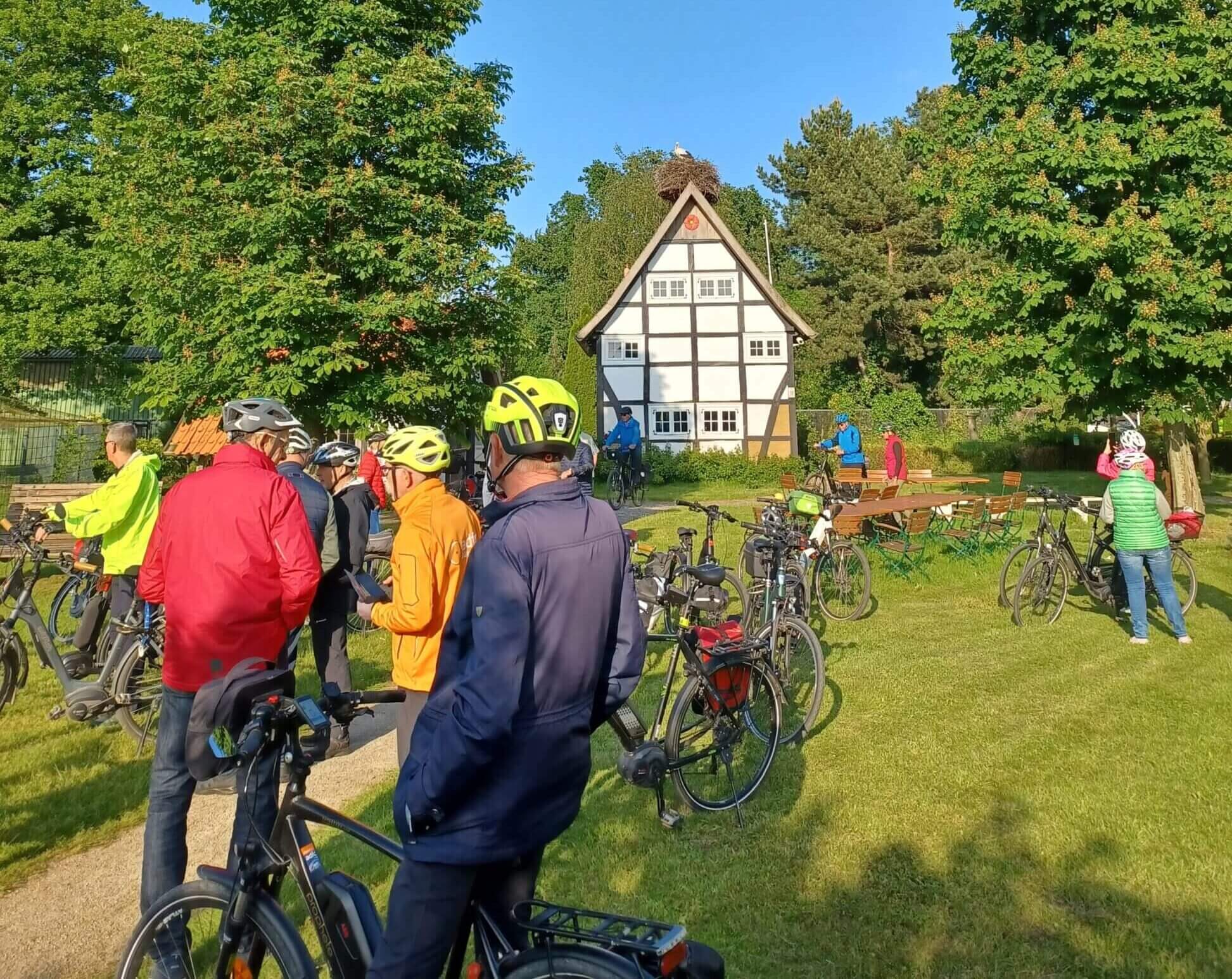Teilnehmende einer Langenberger Radtour bei einer Pause im Storchendorf Verlar nahe Salzkotten. Foto: ADFC.
