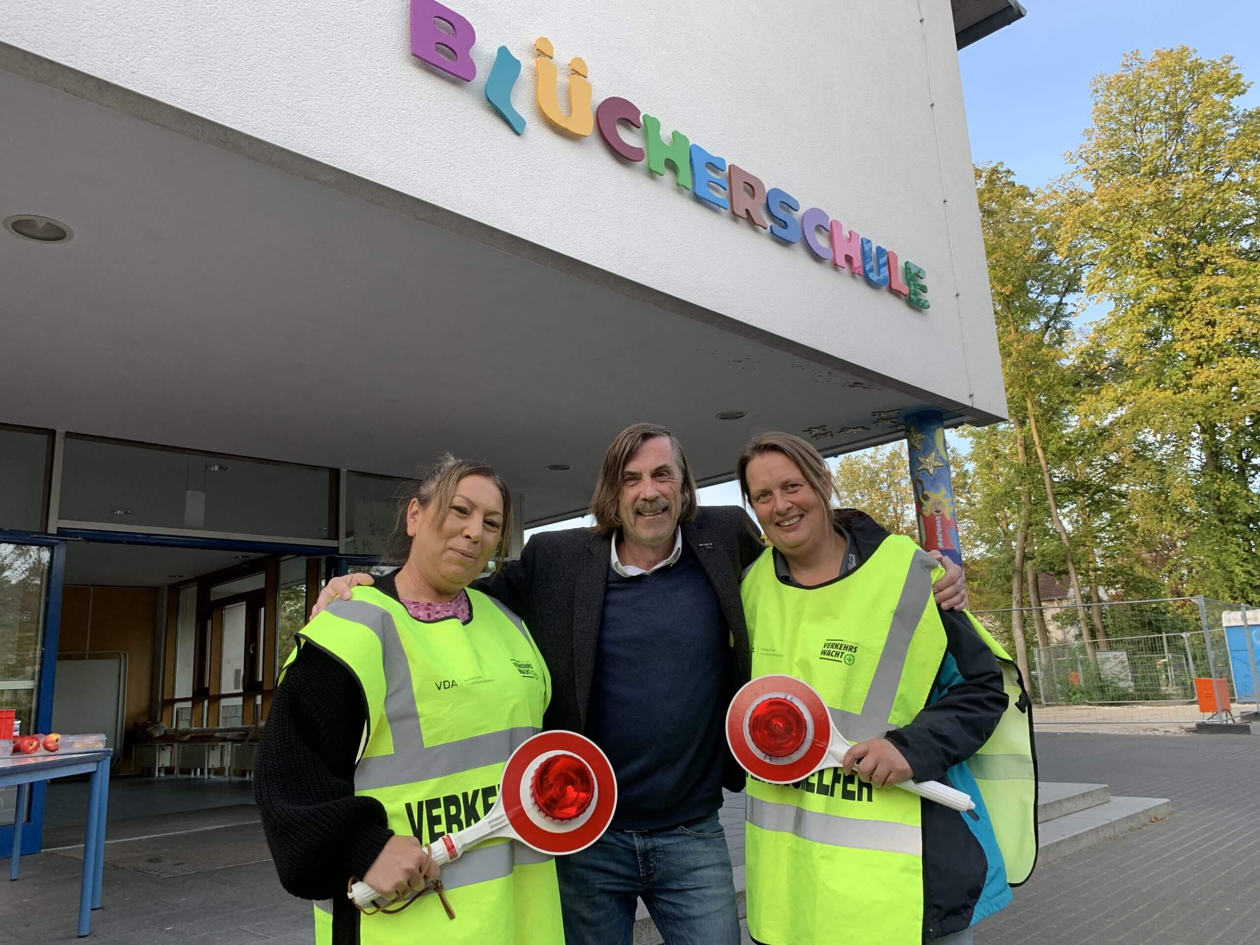 BU Schülerlotsen: Eltern engagieren sich als Schülerlotsen freiwillig für einen sicheren Schulweg: (v.l.) Özlem Eren, Bürgermeister Norbert Morkes, Nina Dragunski. Foto: Stadt Gütersloh.