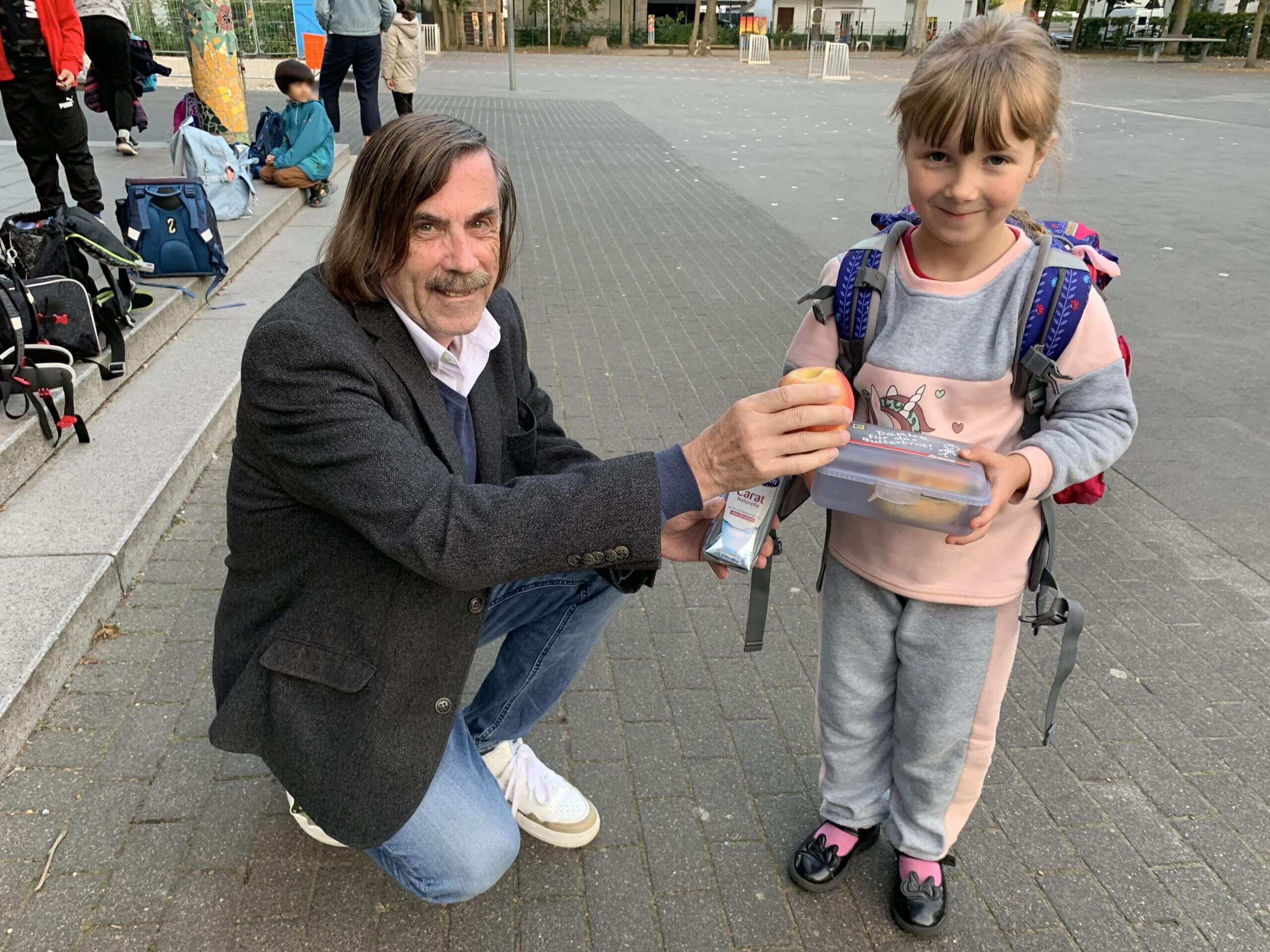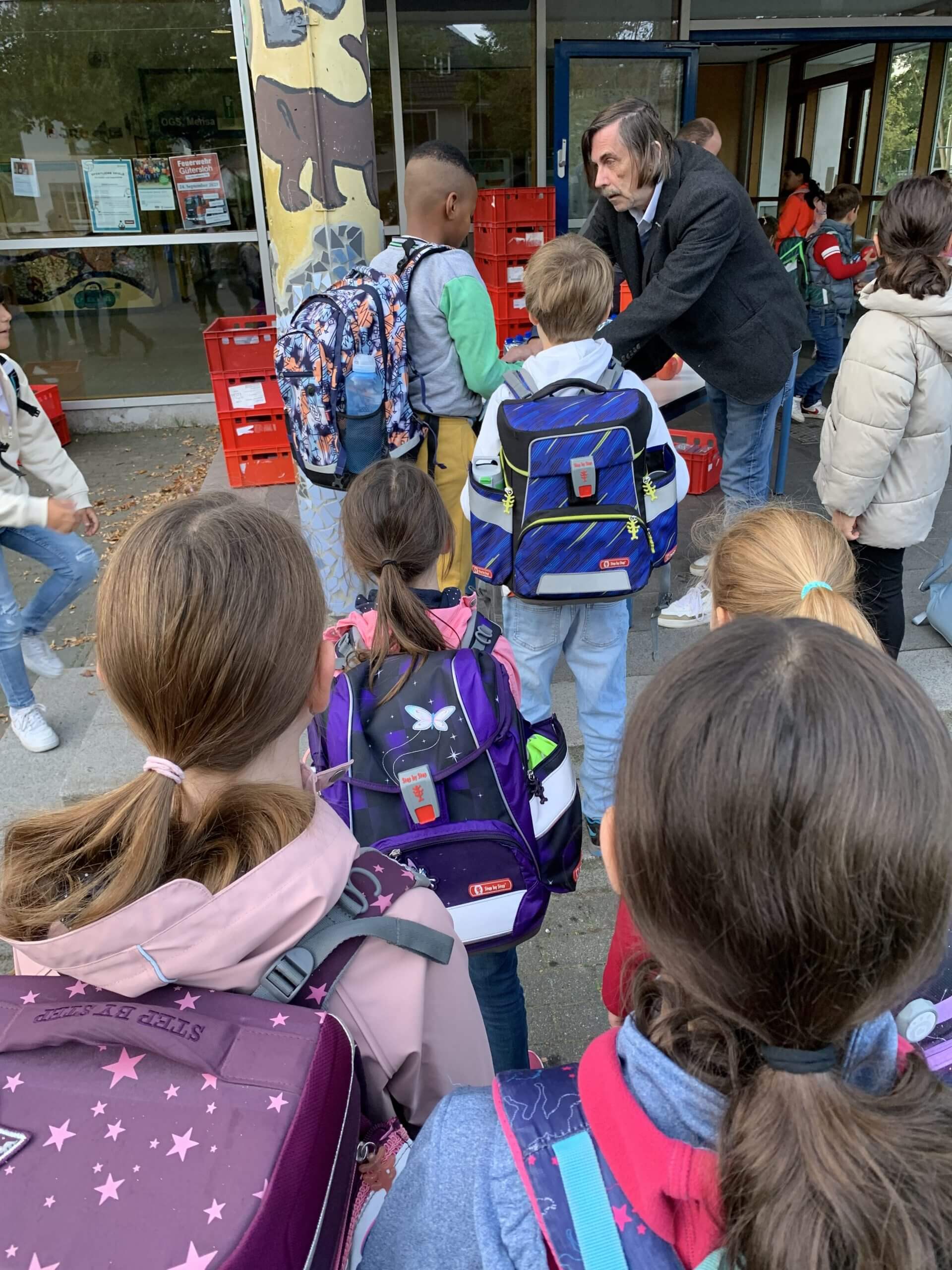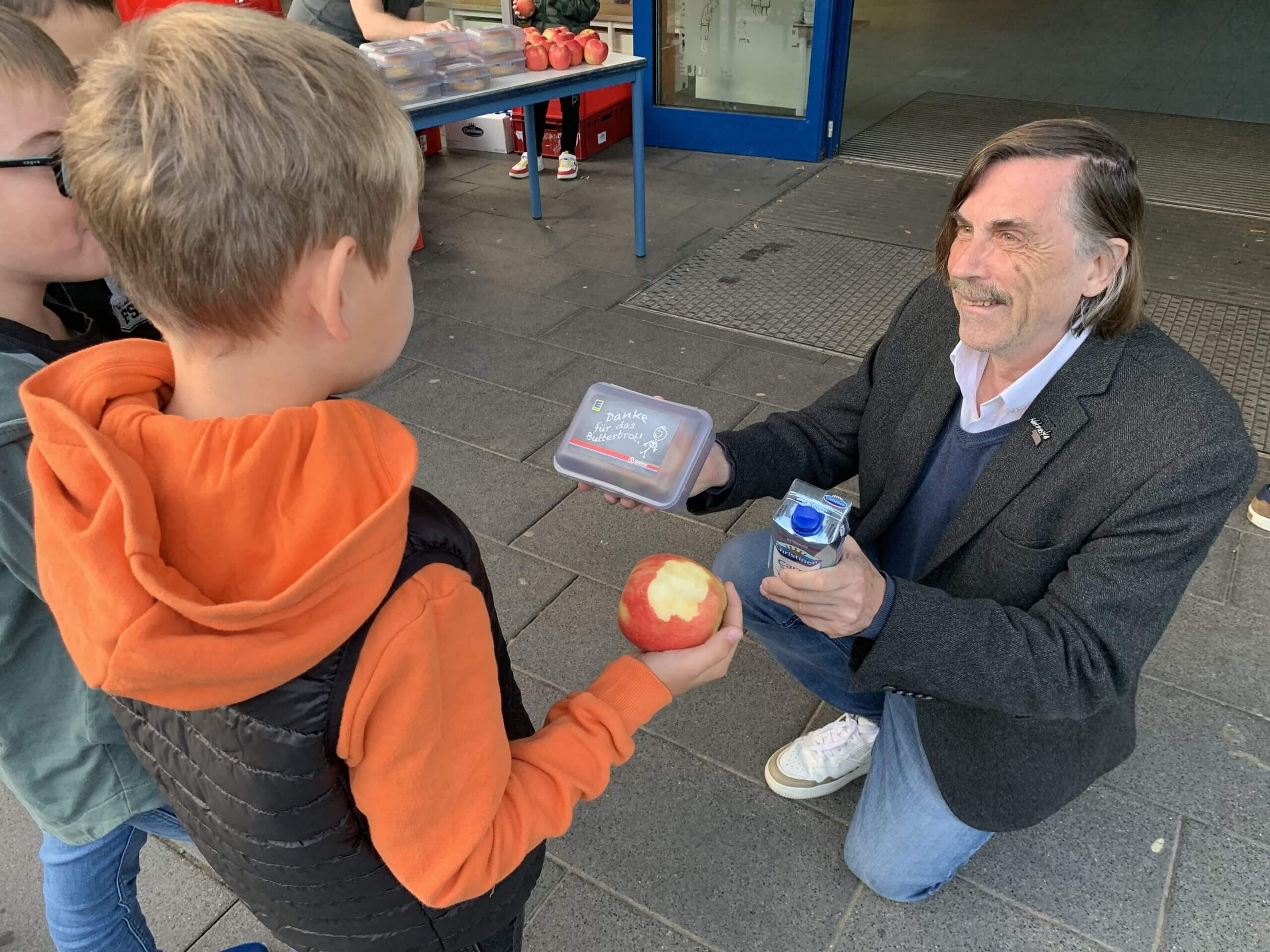 Gütersloh (gpr). Die Kinder der Blücherschule haben am heutigen Mittwochmorgen große Augen gemacht, als sie zur Schule kamen: Vor dem Eingang wartete eine Tafel bestückt mit Frühstücksutensilien auf sie. Das Paket des Schulwegfrühstücks umfasste eine gefüllte Brotdose, einen rotglänzenden Apfel und ein kühles Wasser, das den rund 230 Schülerinnen und Schülern von einem nicht ganz Unbekannten überreicht wurde. „Den kenn ich“, rief der neunjährige Jarosch. „Das ist Nobby, der Bürgermeister.“ Passend zum Internationalen Weltkindertag hat Bürgermeister Norbert Morkes die Frühstücksaktion begleitet. Der ausführende städtische Fachbereich Stadtplanung verfolgt damit ein bestimmtes Ziel: Das Projekt „Lass(t) uns laufen“ soll Kindern und Eltern stärker ins Bewusstsein gerufen werden, um den Schulweg sicherer und nachhaltiger zu gestalten. Während der sechsjährige Matvii das Frühstückspaket in die Hand gedrückt bekam, erzählte er dem Bürgermeister: „Ich fahre morgens mit meiner Mama immer mit dem Fahrrad zur Schule. Das ist schneller als zu Fuß.“ Ein gutes Beispiel, trotzdem fuhren auch an diesem Morgen Autos vor die Schule und setzen Kinder ab. „Wenn das Projekt ‚Lass(t) uns laufen‘ mehr Aufmerksamkeit bekommt, haben wir schon viel erreicht“, so Morkes.