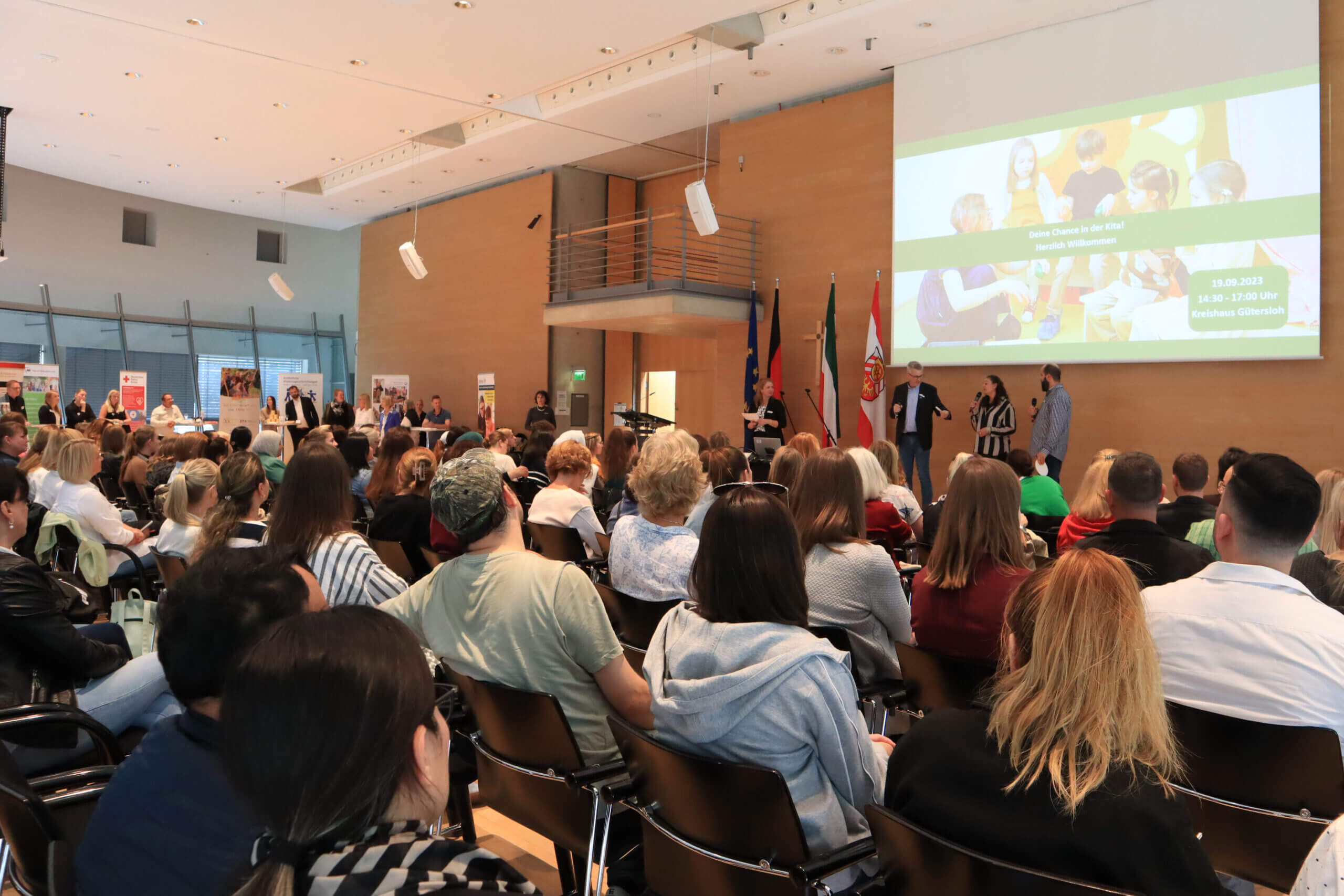 Interviews mit Erzieherinnen und Erziehern sowie mit Kinderpflegerinnen und Kinderpflegern, ein Film über diese Berufe oder direkt im Gespräch bei den neun ausstellenden Kita-Trägern und Berufskollegs: Die mehr als 100 Anwesenden im Sitzungssaal des Kreishauses Gütersloh konnten viele Informationen aufnehmen. Im Podiumsgespräch schilderten auch Sarah Pelster, Evangelische Tageseinrichtung für Kinder Jona in Harsewinkel, und Zufia Lagan, städtische Kita Wöstmannweg, ihre Erfahrungen und ihren Alltag im Bereich Kinderbetreuung. „Jeder Tag ist anders und mit den Kindern zu arbeiten macht großen Spaß“, erklärte Lagan. Sie war durch das Alltagshelfer-Programm zur Kita gekommen, jetzt arbeitet sie nach einer Ausbildung als Kinderpflegerin. Auch Sarah Pelster sprach eine deutliche Empfehlung für diese Berufswahl aus und machte deutlich: „Dieser Job ist für mich Beruf und Berufung zugleich“. Bei den Teilnehmenden weckte vor allem die praxisintegrierte Ausbildung (PiA) großes Interesse.