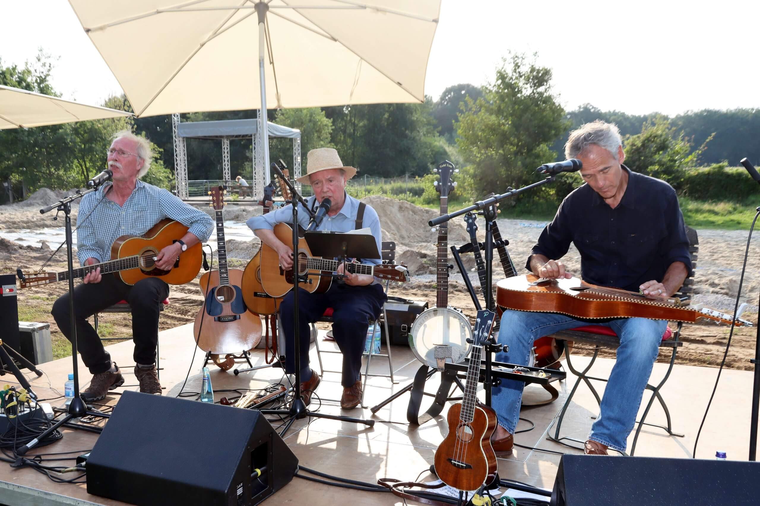 Gütersloh (gpr). Musikalisch ausgefeilte Arrangements auf seltenen sowie gewöhnlichen Saiteninstrumenten und speziellen Holzblasinstrumenten erwarteten die Besucher beim Weltstadtmusik-Event des städtischen Fachbereichs Kultur. Es war das letzte Konzert der Reihe in dieser Saison. Das multilinguale „Dragseth-Trio“, vor 40 Jahren in der gleichnamigen Husumer Traditionsgaststätte von Kalle Johannsen und Manuel Knortz als Duo gegründet, tourt seit 2007 zusammen mit dem Liedermacher Jens Jesse durch Deutschland und Dänemark und gastierte am vergangenen Sonntag im Wapelbad. Die drei Barden verzauberten bei heiterem Sonnenschein und einem leichten Lüftchen mitten im satten Grün ein fasziniert lauschendes Auditorium mit wundervollen Songs und tollen Geschichten. „Am grauen Strand, am grauen Meer“, eine Eigenkomposition aus dem Zyklus, in dem „Dragseth“ überaus erfolgreich Gedichte von Theodor Storm vertont hat, eröffnete den Reigen. Das sogenannte Husum-Gedicht „Die Stadt“ fesselte das Auditorium, das den literarischen Ruf der Stadt am Meer einsaugen konnte.