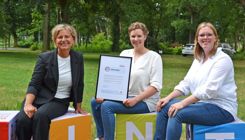 Bild: Freuen sich über die Auszeichnung: Nikola Weber, Franziska Monkenbusch und Julia Seggewiß mit dem zdi-Qualitätssiegel 2023. (Foto: pro Wirtschaft GT GmbH)