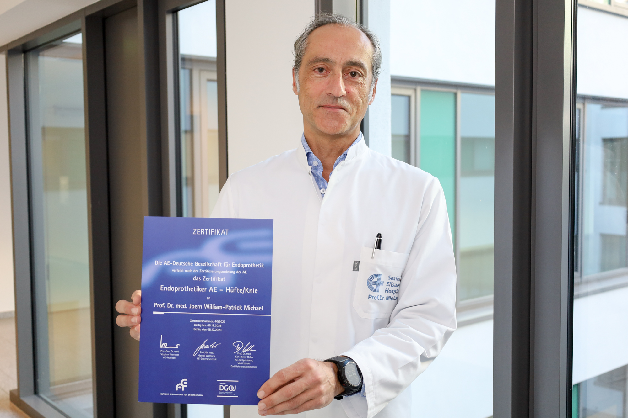 Ausgezeichneter Endoprothetiker: Prof. Dr. Joern Michael, Chefarzt der Klinik für Orthopädie des Sankt Elisabeth Hospitals, freut sich über das Zertifikat durch die AE-Deutsche Gesellschaft für Endoprothetik.
