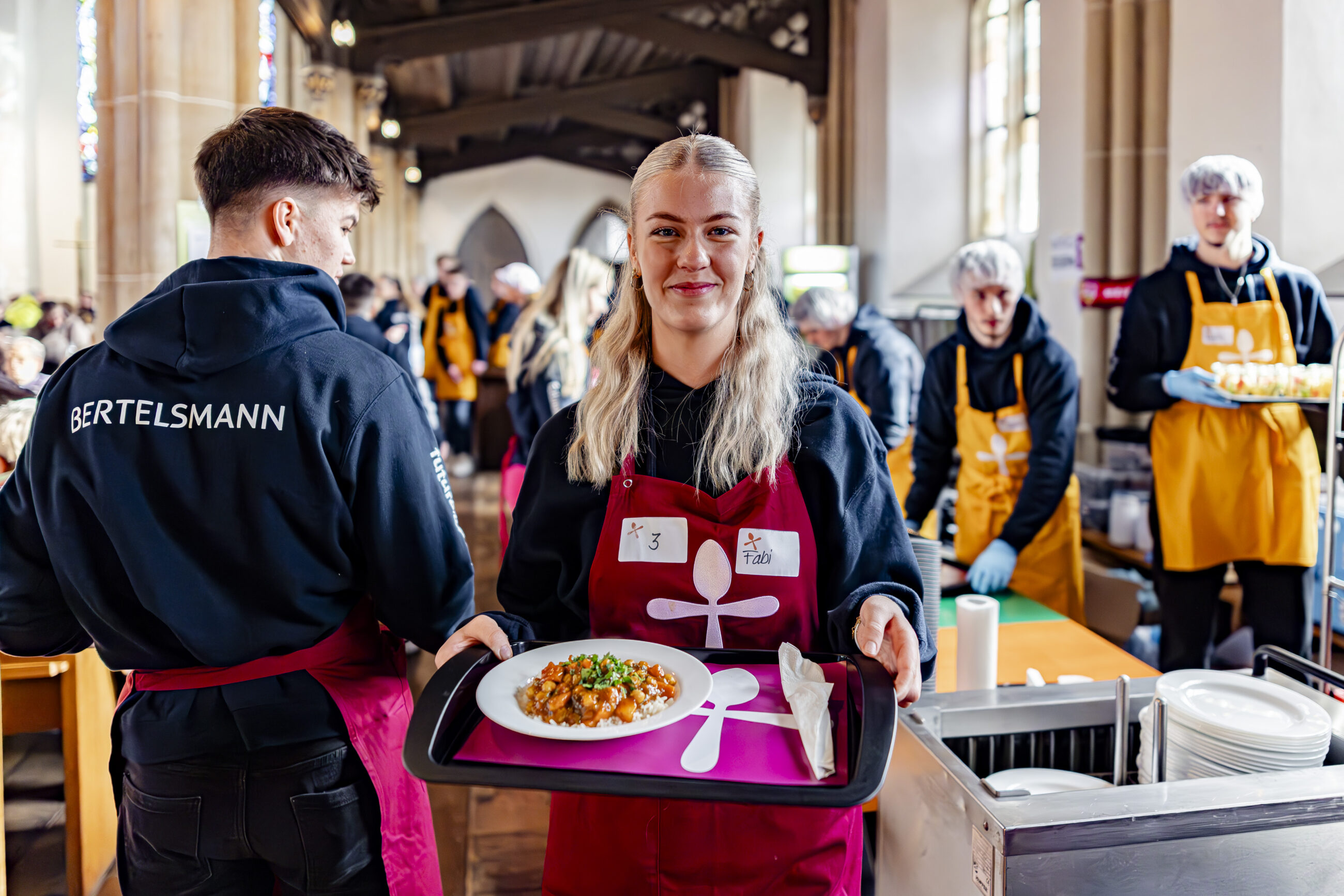 Die 30 Bertelsmann-Auszubildenden zeigten Teamgeist, während sie sich in der Vesperkirche engagierten.