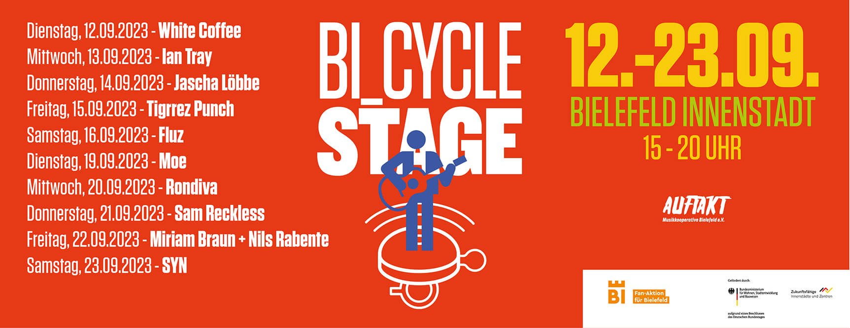Dazu fahren Bielefelder Musiker:innen an ausgewählten Tagen im September mit einem umgebauten Lasten-E-Bike, in das eine Bühne integriert ist, quer durch die City und sorgen mit überraschenden und spontanen Auftritten für eine gute Atmosphäre. Unaufdringlich, sympathisch, aber trotzdem professionell und mit gutem Sound.