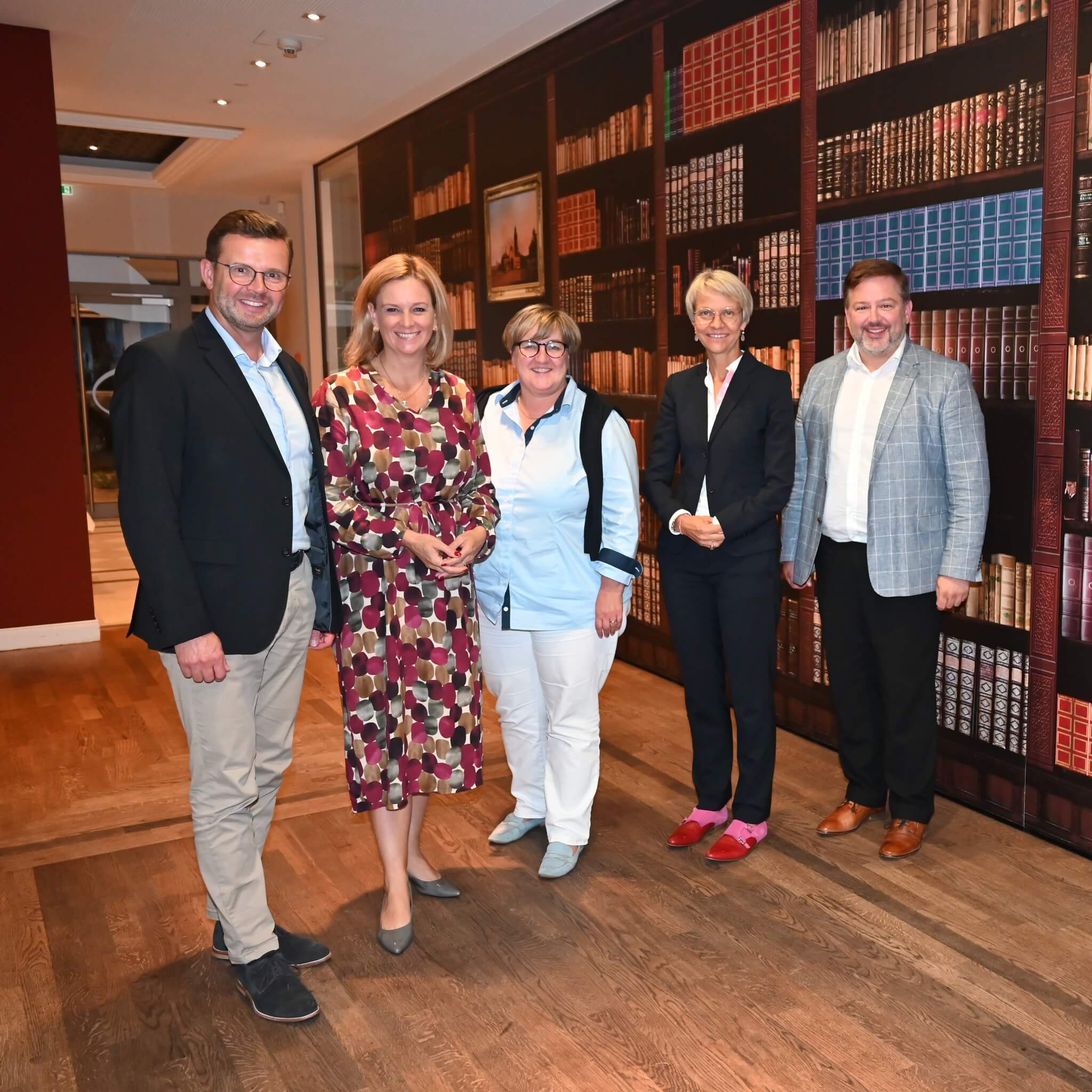Foto: Landtagsabgeordneter und CDU-Kreisvorsitzender Raphael Tigges, stellvertretende Kreisvorsitzende Pamela Westmeyer, Kreistagsfraktionsvorsitzende Birgit Ernst, Ministerin Dorothee Feller und Marco Talarico, CDU-Fraktionsvorsitzender in Rietberg (v.l.).