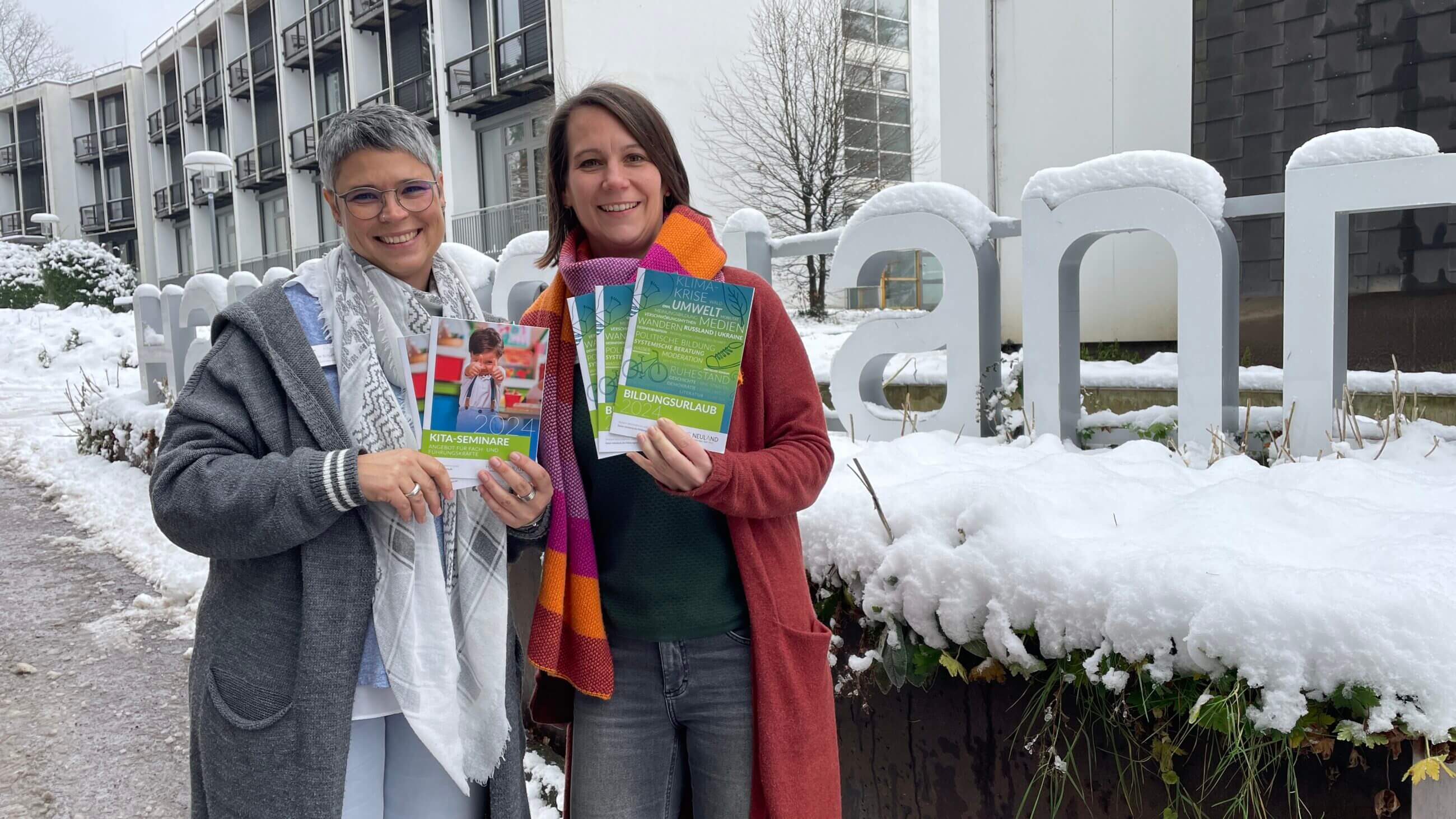 Präsentieren das neue Jahresprogramm für Kita-Seminare und Bildungsurlaub 2024 (v.l.): Kerstin Schalles (Fachbereichsleitung Berufliche Bildung) und Nadja Bilstein (Fachbereichsleitung Politische Akademie) Foto: Lars Wellhöner/Haus Neuland