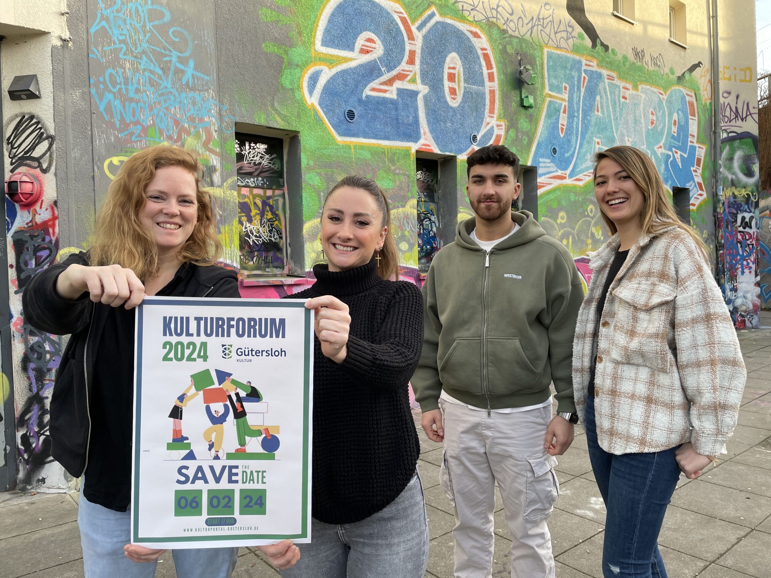 Laden gemeinsam herzlich zum diesjährigen Kulturforum im städtischen Jugendtreff Bauteil 5 ein: (v.l.) Lena Jeckel (Leiterin Fachbereich Kultur) und Sara Aydin (Leiterin Bauteil 5) mit Devrim Celik (Sozialarbeiter Bauteil 5) und Nicole Vive (Sozialarbeiterin Bauteil 5). Foto: Stadt Gütersloh
