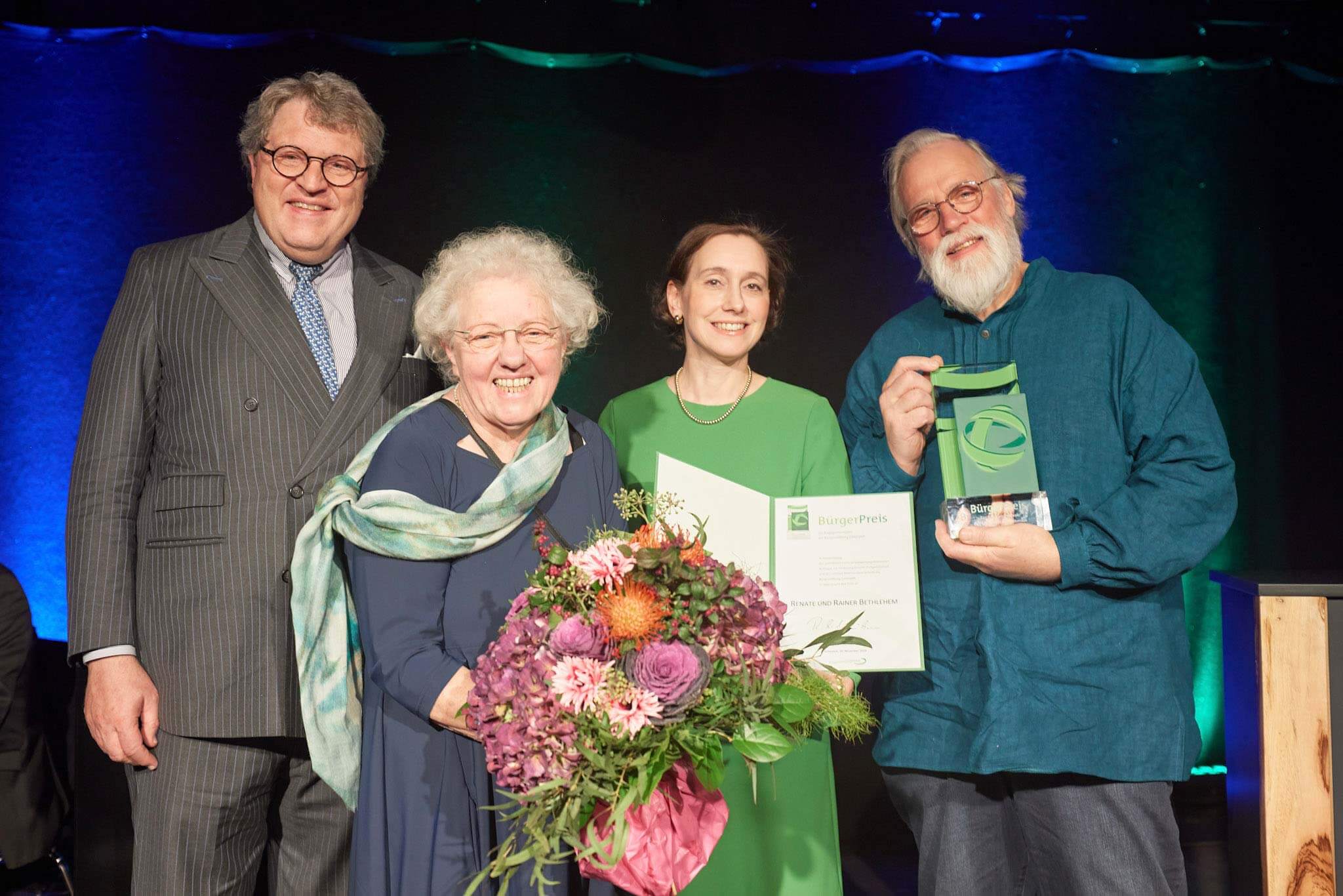Ausgezeichnet mit dem BürgerPreis 2023 der Bürgerstiftung Gütersloh wurden Renate und Rainer Bethlehem am Donnerstag bei einer Feierstunde in der Weberei. Dr. Reinhard Zinkann, Kuratoriumsvorsitzender der Stiftung, und deren Vorstandsvorsitzende Katrin Meyer überreichten Preis, Urkunde und Blumen an das engagierte Paar.