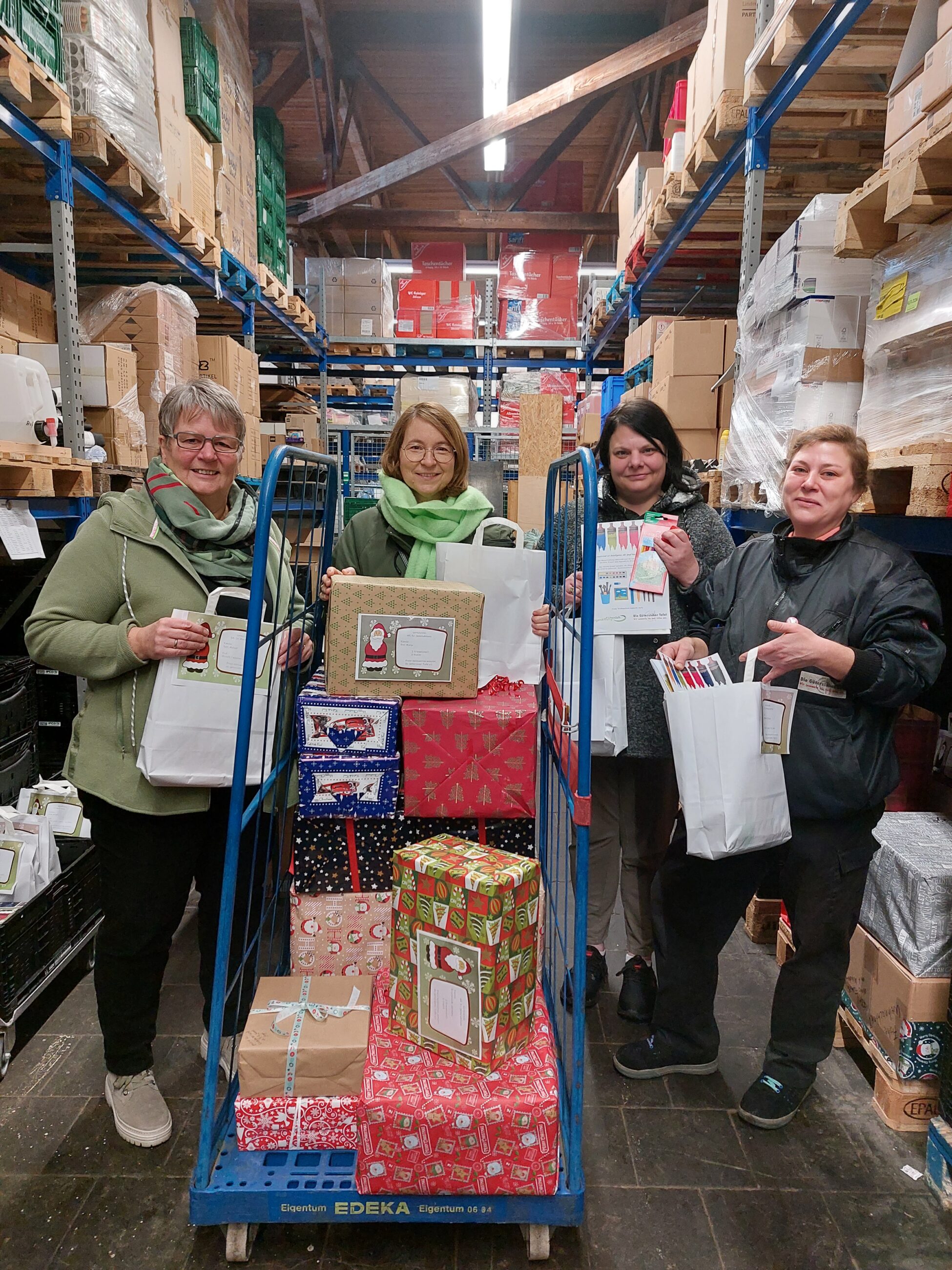 Weihnachten kann kommen: Dank Unterstützung der Bürgerstiftung konnten 830 Weihnachtstüten für Kinder und Jugendliche bedürftiger Familien gepackt werden. Beim Besuch im Zentrallager überzeugten sich (v. l.) Tafel-Geschäftsführerin Ruth Prior-Dresemann, Bürgerstiftungs-Geschäftsführerin Nina Spallek sowie die ehrenamtlichen Helferinnen Daniela Mische und Rafaela Pauli, dass alles fertig ist.