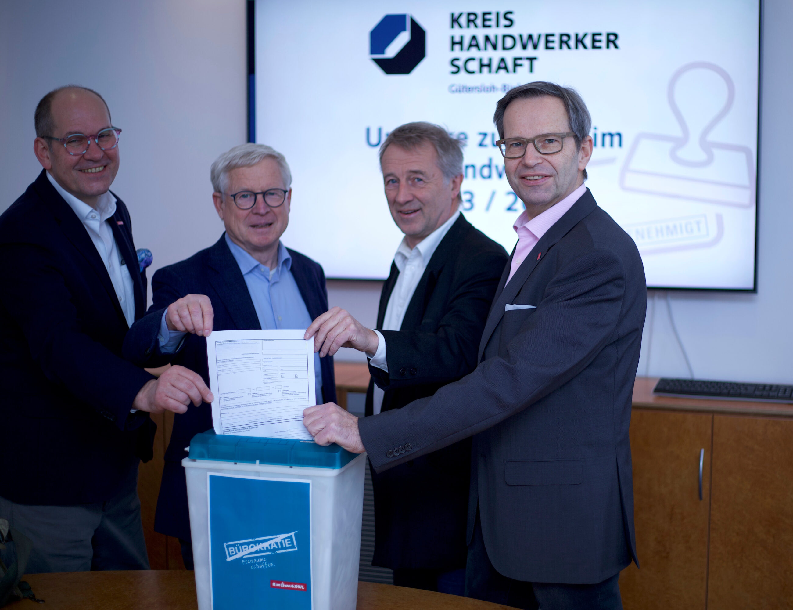 Schicken überflüssige Formulare durch den Bürokratie-Schredder (v.l.n.r.): Der stv. Hauptgeschäftsführer Alexander Kostka, Kreishandwerksmeister Georg Effertz, Hauptgeschäftsführer Jürgen Sautmann und Kreishandwerksmeister Frank Wulfmeyer. Bild: Matthias Stockkamp.