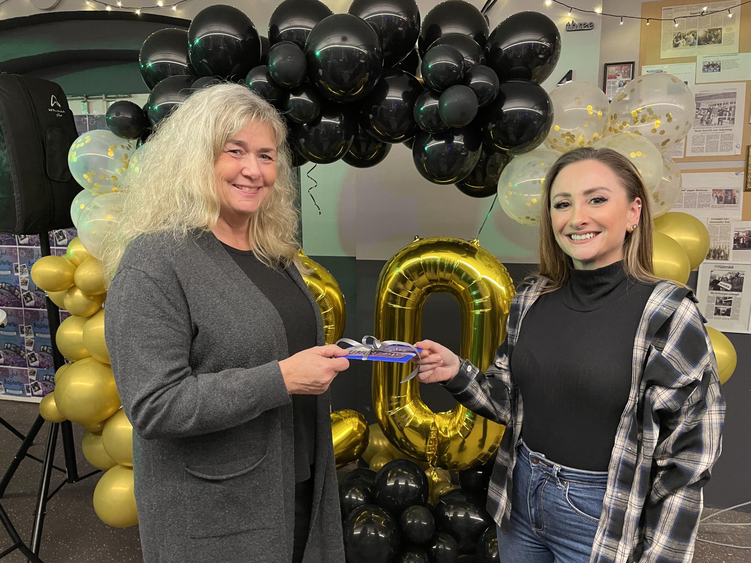 (v.l.) Ines Lehn, Leiterin der Abteilung Kinder- und Jugendförderung bei der Stadt Gütersloh, überreichte ein Geburtstagsgeschenk an Sara Aydin, Einrichtungsleiterin des Bauteil 5: einen 500 Euro-Gutschein. Mit dieser Unterstützung soll ein kleines Fitnessstudio im Jugendtreff eingerichtet werden, um dem Wunsch der Jugendlichen nach mehr Sportangeboten nachzukommen. Foto: Stadt Gütersloh
