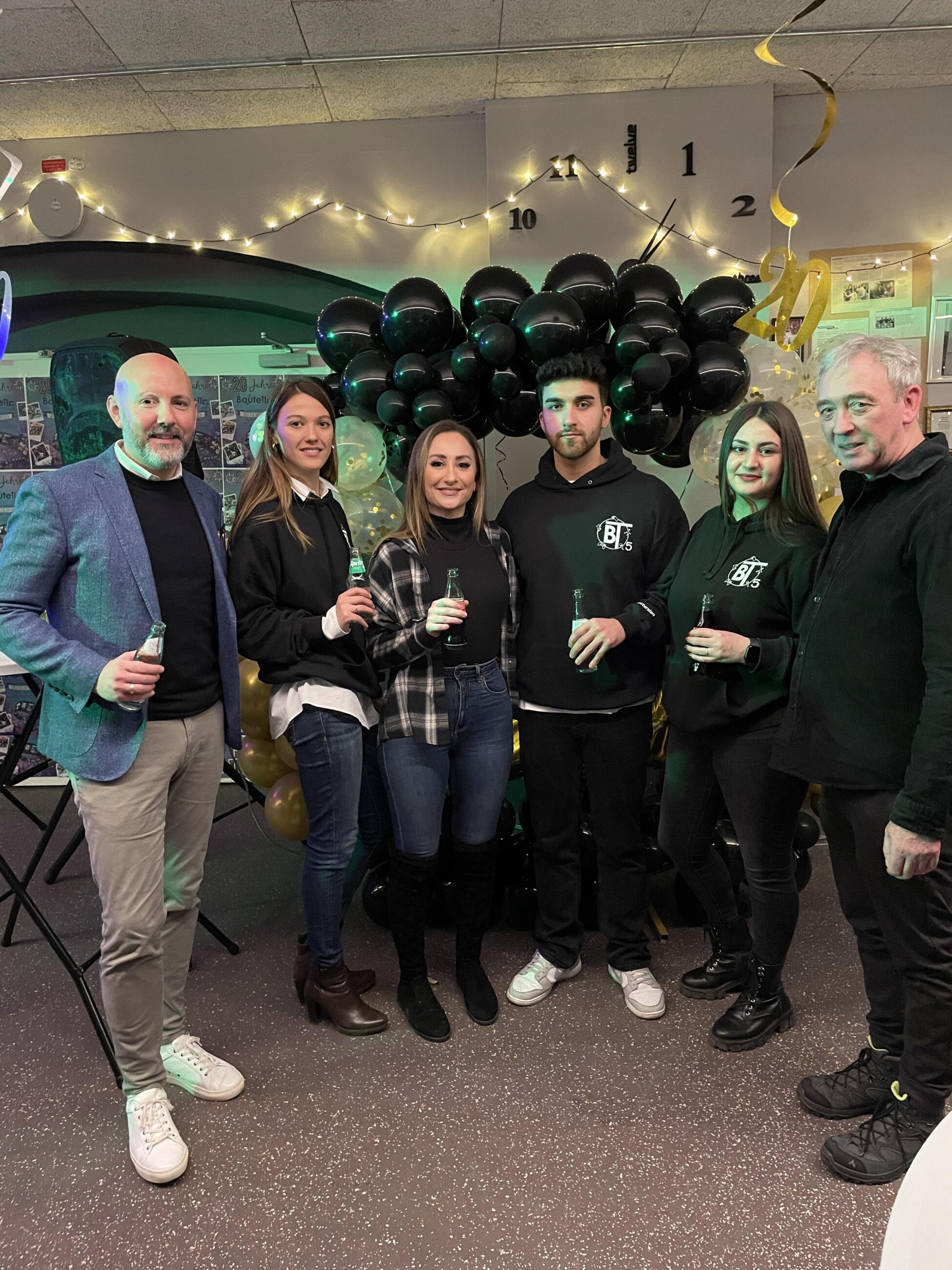 BU Gruppenfoto Team: Freuen sich über die gelungene Party zum 20-jährigen Bestehen des Bauteil 5: (v.l.) Henning Matthes, Erster Beigeordneter und Jugenddezernent der Stadt Gütersloh, das aktuelle Team des Bauteil 5 bestehend aus Nicole Vive, Sara Aydin (Einrichtungsleiterin), Devrim Celik, Anatoli Sachanidou und Teamleiter Jörg Teckemeier. Foto: Stadt Gütersloh