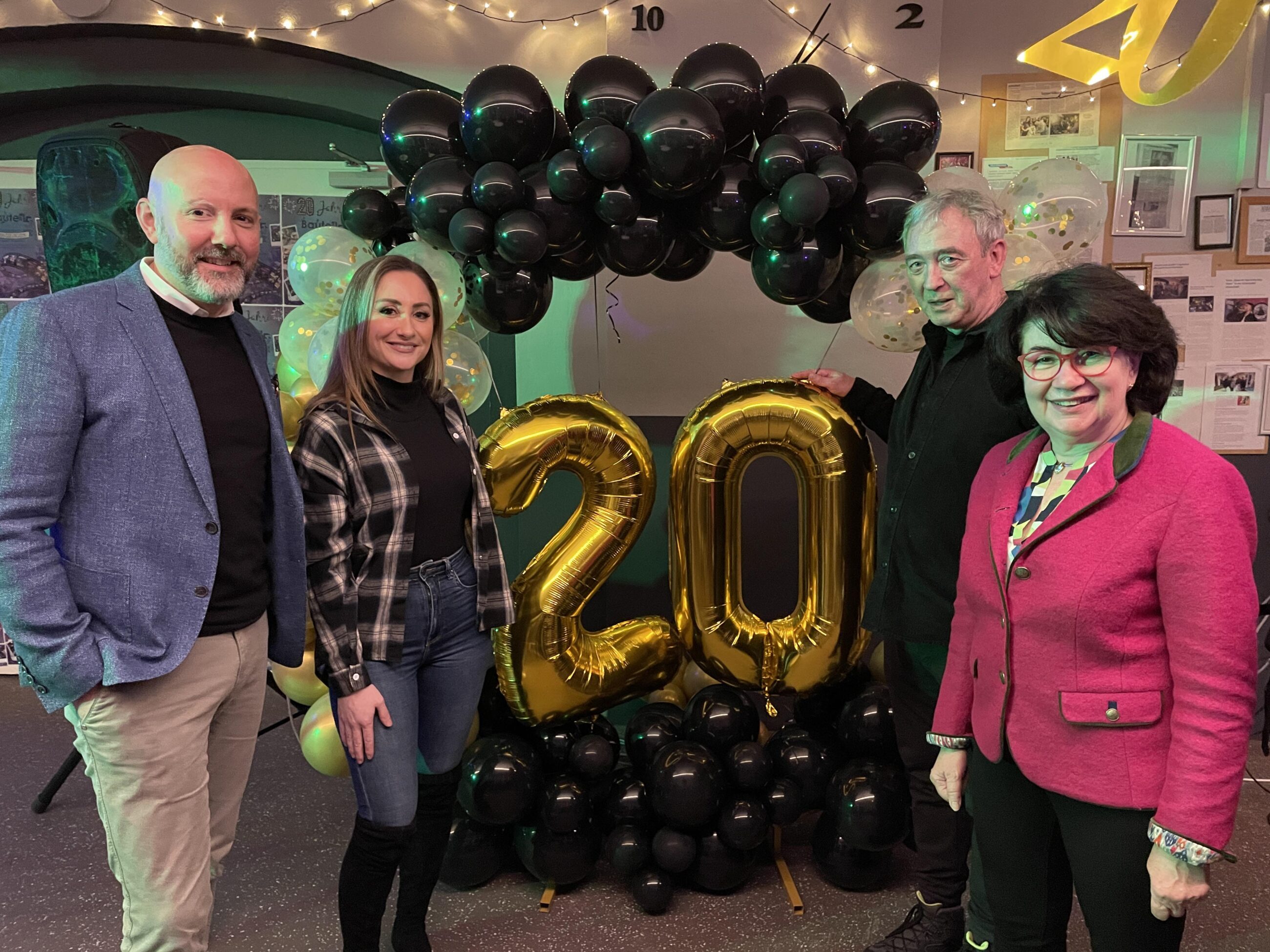 Gratulation zum 20-jährigen Bestehen des städtischen Jugendtreffs Bauteil 5: (v.l.) Henning Matthes (Erster Beigeordneter und Jugenddezernent der Stadt Gütersloh), Sara Aydin (Einrichtungsleiterin), Teamleiter Jörg Teckemeier (Fachbereich Jugend und Familie der Stadt Gütersloh) und die frühere Bürgermeisterin Maria Unger. Foto: Stadt Gütersloh
