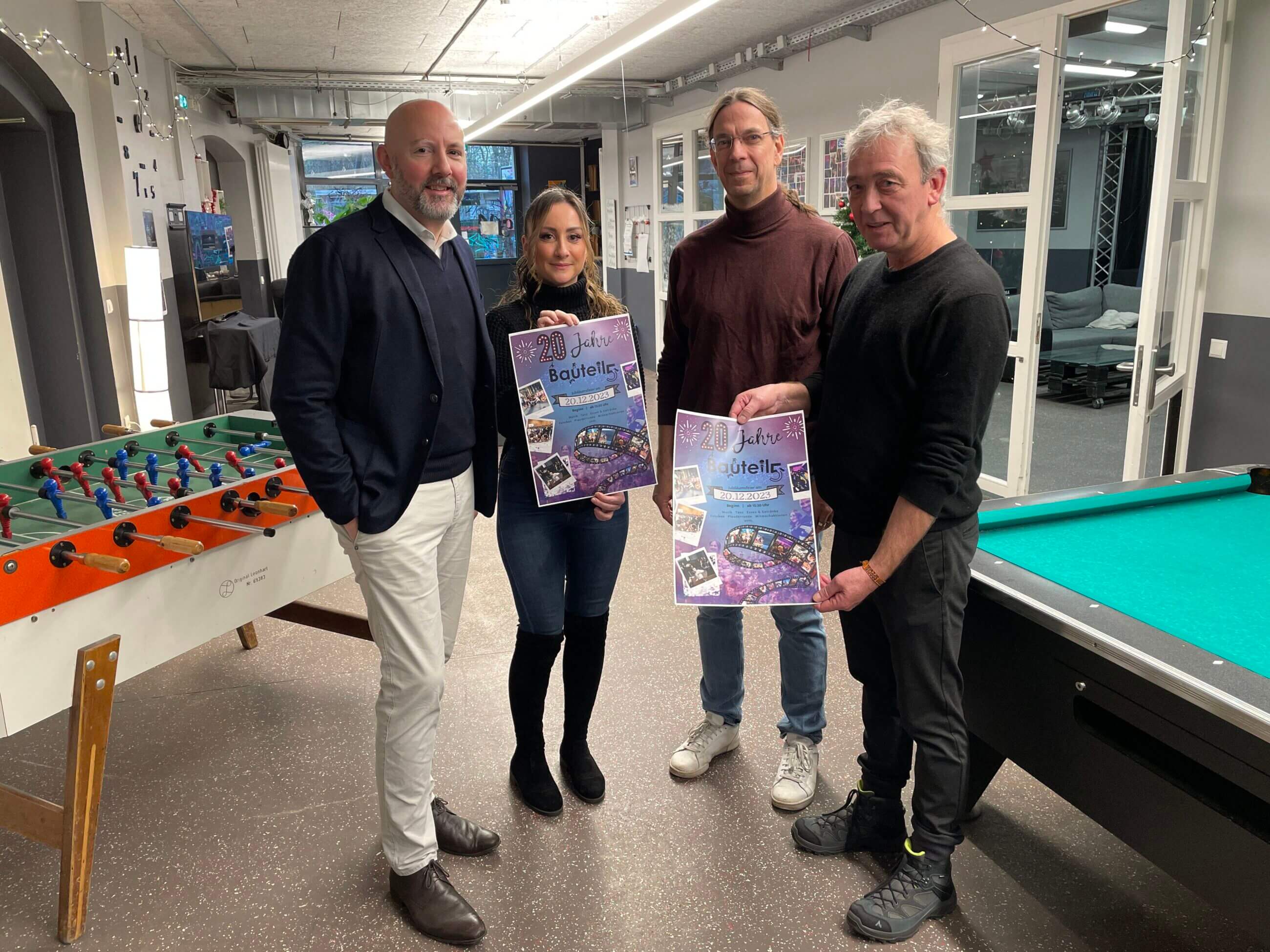 BU: Laden herzlich zum 20-jährigen Bestehen des Bauteils 5 ein: (v.l.) Henning Matthes (Beigeordneter für Familie, Jugend, Schule, Soziales und Sport), Sara Aydin (Einrichtungsleiterin des Bauteils 5), Andreas Reinhold (Leiter Fachbereich Jugend und Familie) und Jörg Teckemeier (Teamleitung offene Kinder- und Jugendarbeit). Foto: Stadt Gütersloh.