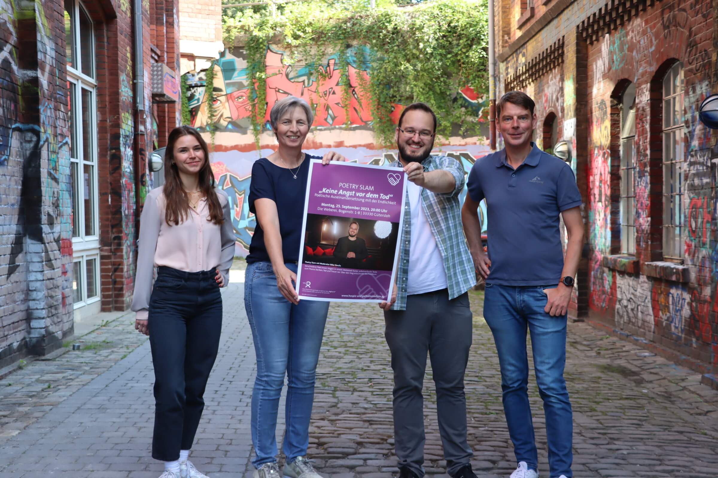 von links: Laura Seppmann (Programm-Team Weberei), Evelyn Dahlke (Hospiz- und Palliativ-Verein Gütersloh), Niko Sioulis (Slam-Moderator) und Steffen Böning (Weberei-Chef) freuen sich schon auf den bevorstehenden Poetry-Slam