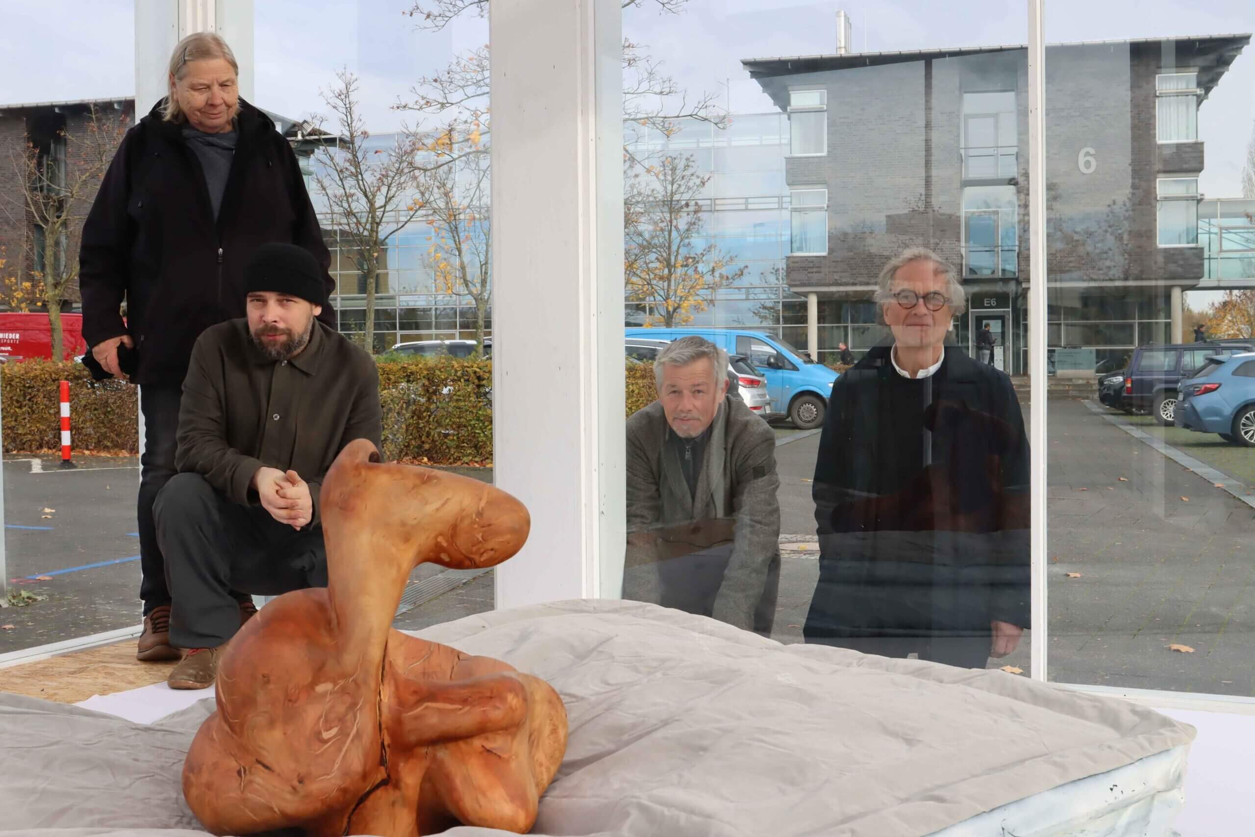 Im Kunstpavillon und jenseits der Scheibe: Rose Lichtenberger (l.) und ihr Sohn Grischa präsentieren gemeinsam im Pavillon vor dem Kreishaus Gütersloh eine Installation. Im Hintergrund Friedrich Wilhelm Schröder, Vorsitzender des Kunstvereins für den Kreis Gütersloh (r.) und Jan Focken (2.v.r.), Leiter Referats Presse, Kultur und Archiv Kreis Gütersloh. Foto: Kreis Gütersloh