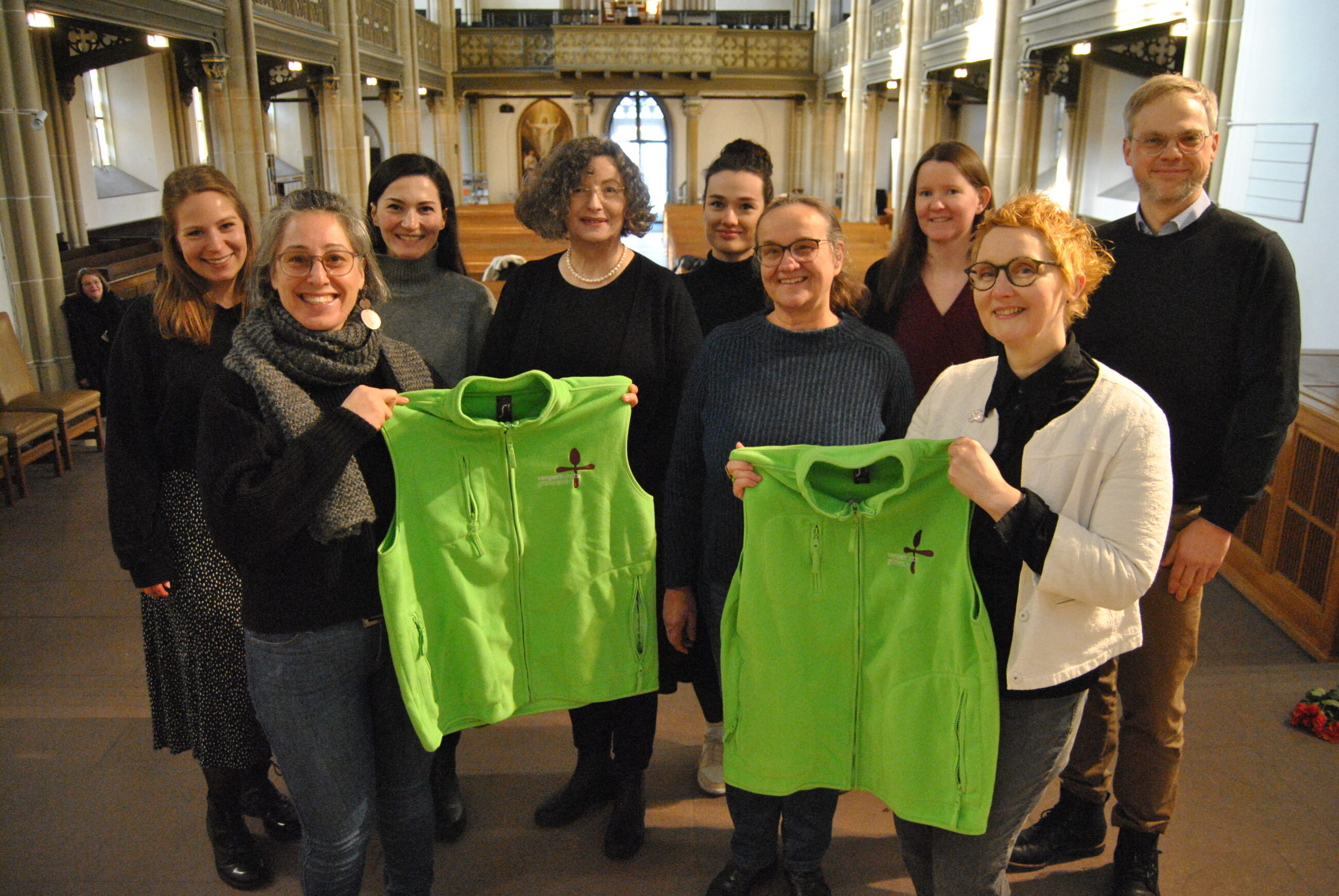 Ziehen die grüne Weste an: Santiago Zamora, Alena Hülsmann, Ulrike Boden, Benjamin Varnholt, Lisa Henke, Katharina Stein, Nicola Bals, Arbnora Seferi-Qengai und Günay Uysal sind einige der Berater, die in den nächsten Tagen in der Vesperkirche ansprechbar sein werden.