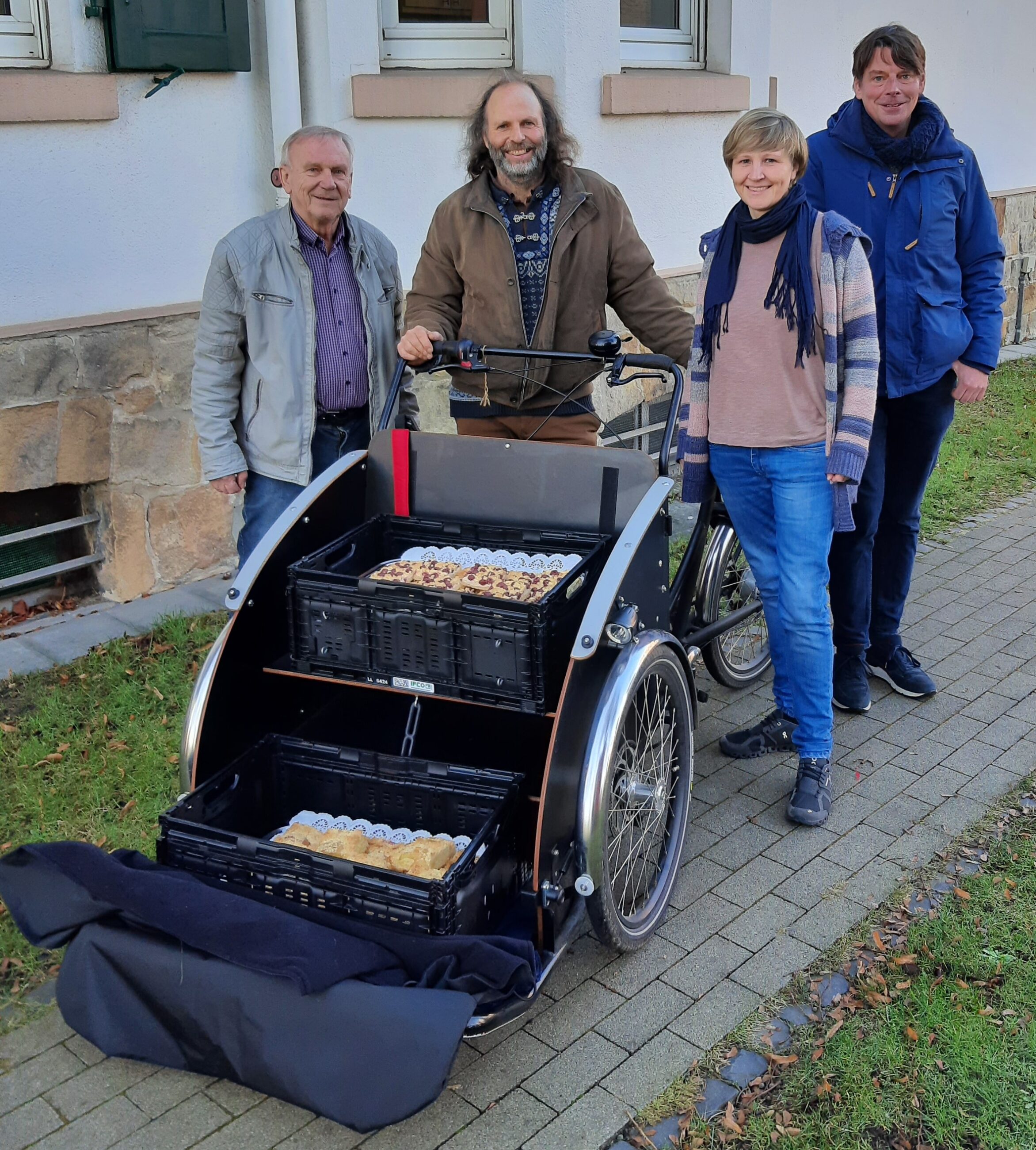 Ökologischer Transport: Dirk Böhm (2.v.l.) wird den Kuchen mit seinem speziell für diesen Zweck umgebauten Rad in die Martin-Luther-Kirche bringen. VHS-Kursleiter Eugen-Peter Krause, Janine Dünninghaus (VHS) und Steffen Böning (Vesperkirche) finden diesen Einsatz aller Ehren wert.