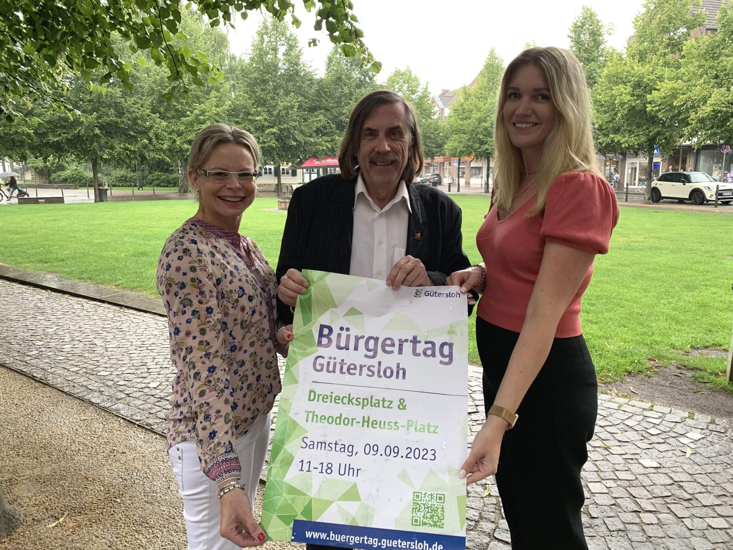 Bild: Vorfreude auf den dritten Gütersloher Bürgertag am 9. September auf dem Dreiecksplatz und Theodor-Heuss-Platz: (von links) Elke Pauly-Teismann (städtische Ehrenamtskoordinatorin), Bürgermeister Norbert Morkes und Christina Junkerkalefeld (Gütersloh Marketing). Foto: Stadt Gütersloh.