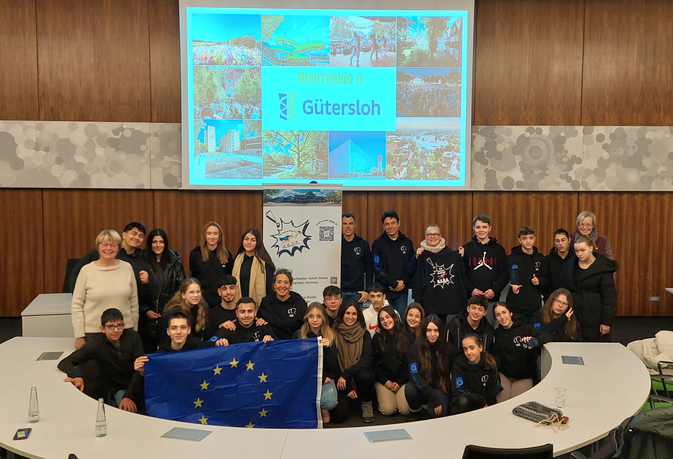 Gütersloh (gpr). Ehrenamtliches Engagement ist oft unsichtbar und dabei essenziell für eine funktionierende Gesellschaft. Umso wichtiger ist es, schon früh ein Bewusstsein für diese wichtige Arbeit zu schaffen – wie zum Beispiel mit dem Projekt „H.E.R.O. – Help everyone, reach out!“. Im Zuge des Projekts sind kürzlich Schülerinnen und Schüler aus Spanien zu Besuch in Gütersloh gewesen. Gemeinsam mit Acht- und Neuntklässlern der Geschwister-Scholl-Realschule haben sie an Workshops mit dem Verein „Gütersloh tatkräftig“, der Tafel, dem Weltladen, der Suppenküche, der Gemeinschaft für Natur und Umweltschutz (GNU) sowie weiteren Vereinen und ehrenamtlich Engagierten teilgenommen. Das Ziel des Projekts: die Jugendlichen informieren und dazu befähigen, sich selbst aktiv in die Gesellschaft einzubringen. Natürlich durfte für die deutsch-spanische Gruppe auch eine offizielle Begrüßung im Rathaus nicht fehlen. Dabei konnten die 30 Jugendlichen nicht nur einen Eindruck vom Ratssaal gewinnen, in dem politische Sitzungen und Veranstaltungen stattfinden, sondern auch mit der stellvertretenden Bürgermeisterin Ingrid Hollenhorst zum Thema „Ehrenamtliches Engagement“ ins Gespräch kommen.