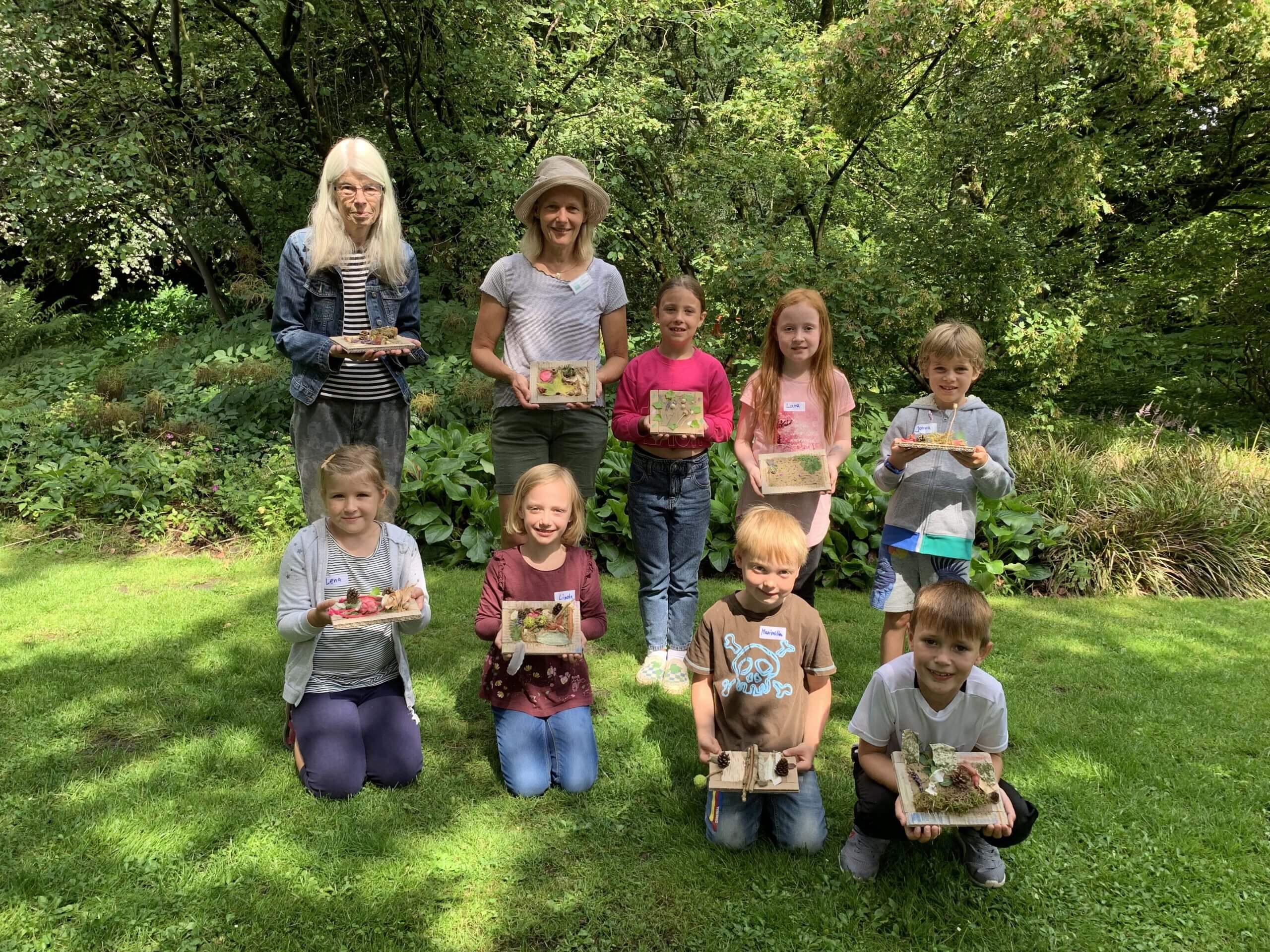 BU3: Nach ereignisreichen Stunden im Botanischen Garten dürfen alle ihren eigenen Traumgarten mit nach Hause nehmen: (v.l.) Adelheid Eimer und Larissa Lakämper vom Förderkreis Stadtpark – Botanischer Garten Gütersloh e.V., Fiona, Lara, Joona, Lena, Linda, Maximilian und Philip.