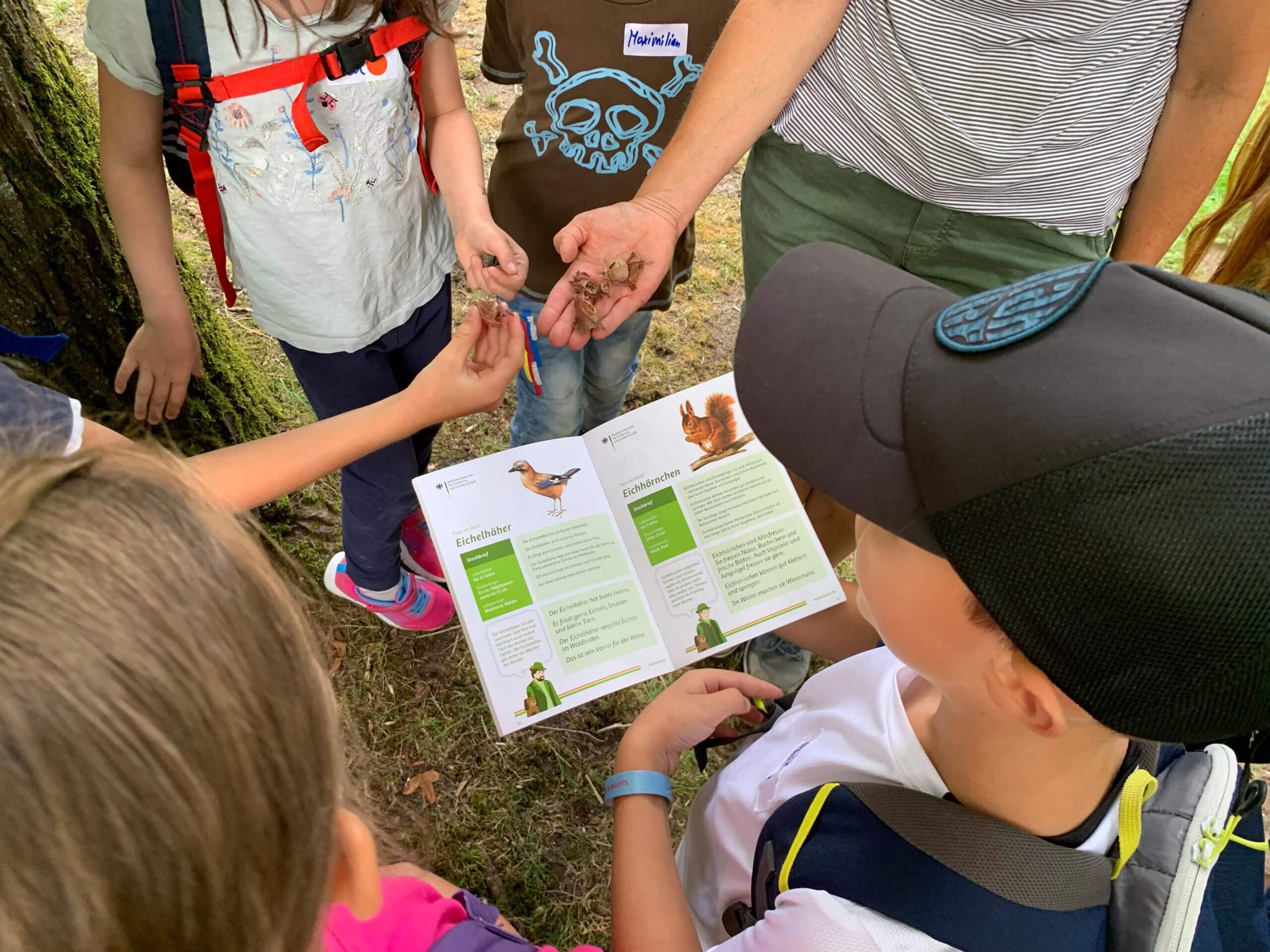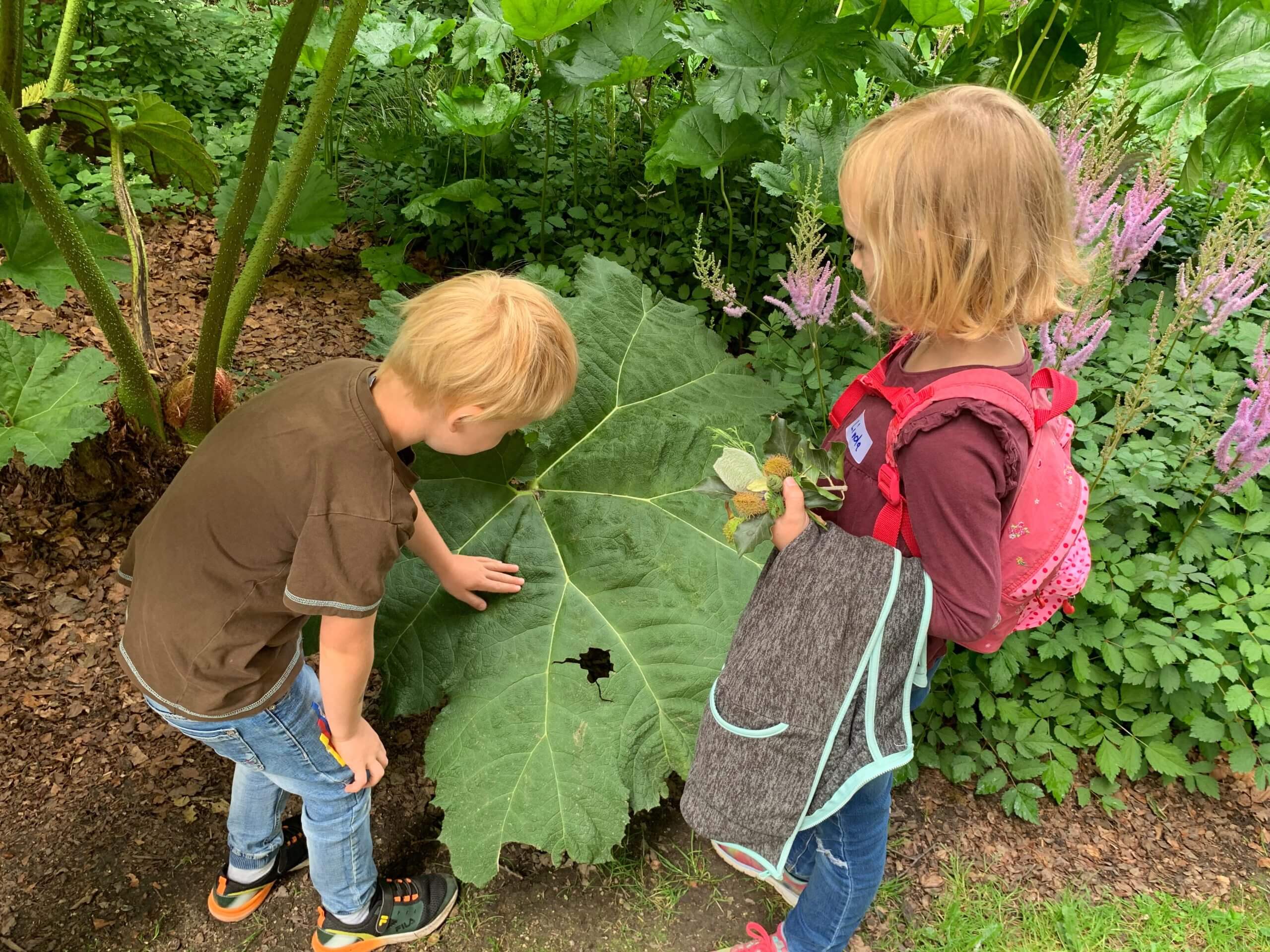 Trotz anfänglichen Nieselregens ist die Stimmung ungetrübt: Nach einem kurzen Kennenlernspiel geht es sofort los mit dem Sammeln der Utensilien für den eigenen Traumgarten. Die erste Beute ist schnell gefunden: Ein paar aufgebrochene Haselnüsse geben Hinweise auf Eichhörnchen und werden im Leinenbeutel gesammelt. Die nächste Station ist der Lavendel-Duftgarten. „Lavendel wirkt beruhigend und wird gerne als Tee getrunken“, erklärt Adelheid Eimer, als ein paar der Kinder heruntergefallene Lavendel-Blüten einsammeln. Direkt daneben befindet sich der Mediterrane Garten mit Zitronen und Feigen. „Diese Pflanzen überwintern in unserem Pflanzenhaus, weil es hier in Deutschland sonst zu kalt für sie wäre“, so Adelheid Eimer weiter. „Gibt es hier auch das Eselsohr?“, möchte eines der Kinder wissen. Kurz danach sitzen alle in der Hocke und streicheln die weichen Blätter des Eselsohrs, eigentlich Wollziest genannt – eine Pflanze, die sich mithilfe des grauen, weichen Flaums vor Hitze schützt.