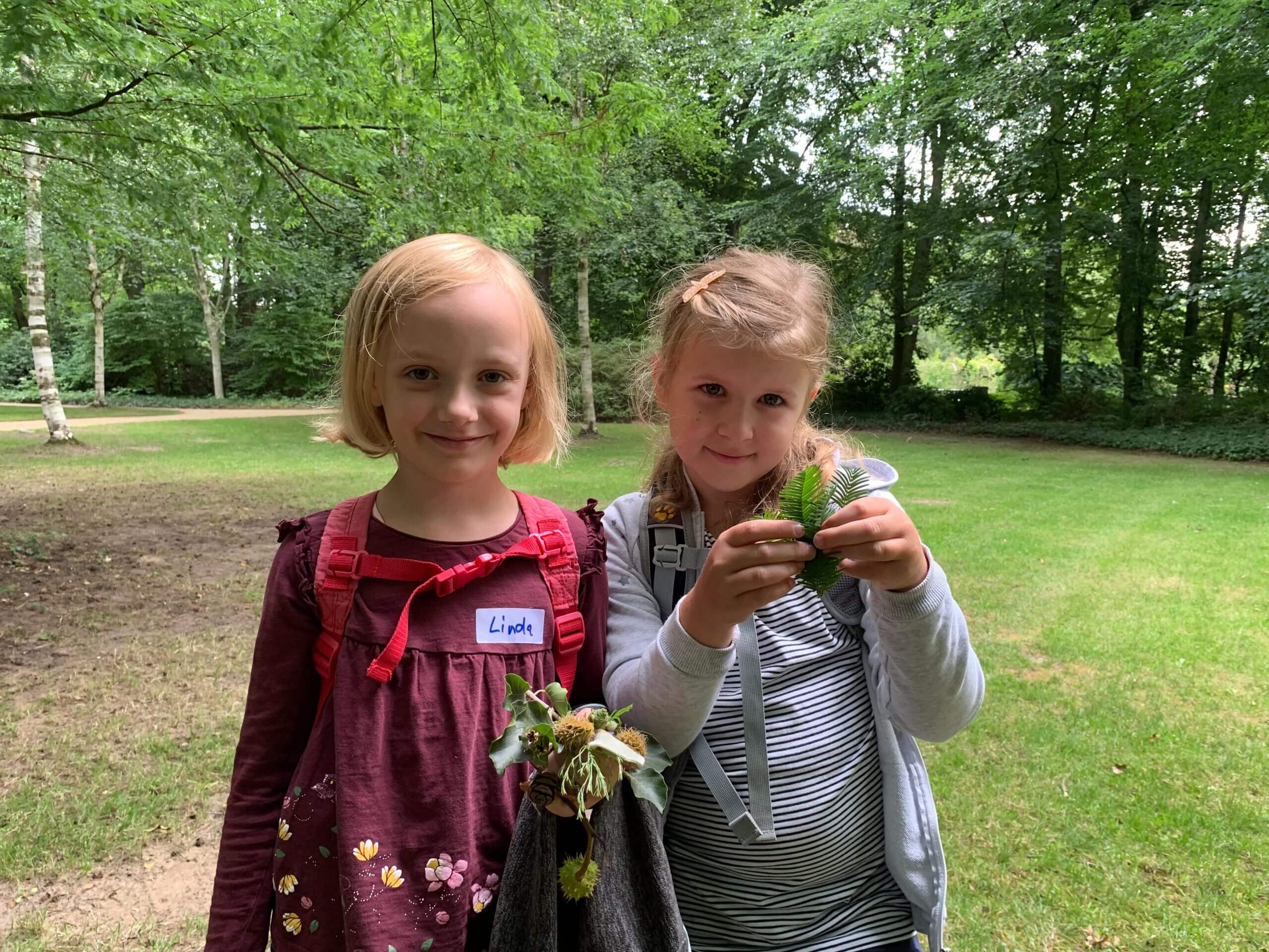 BU5: Blätter, Blüten und Kastanien: Linda und Lena haben einiges gesammelt für ihren Miniaturgarten.
