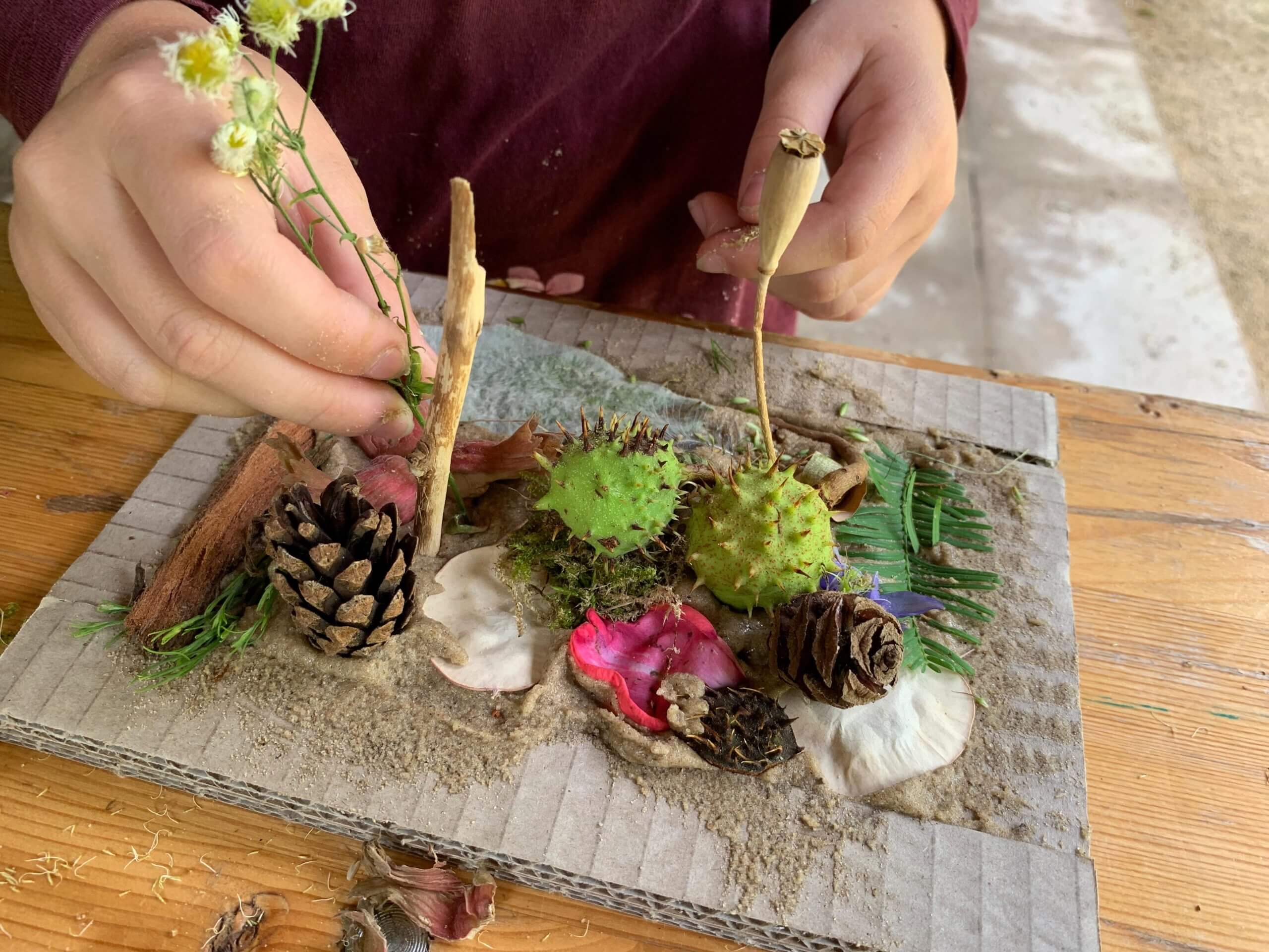 BU1: Tannenzapfen, Kastanien, Rosenblätter – bei der Gestaltung ihrer Traumgärten haben die Kinder präzise Vorstellungen davon, in welche Richtung sich ein Blatt falten oder ein Stängel zur Seite abstehen soll.