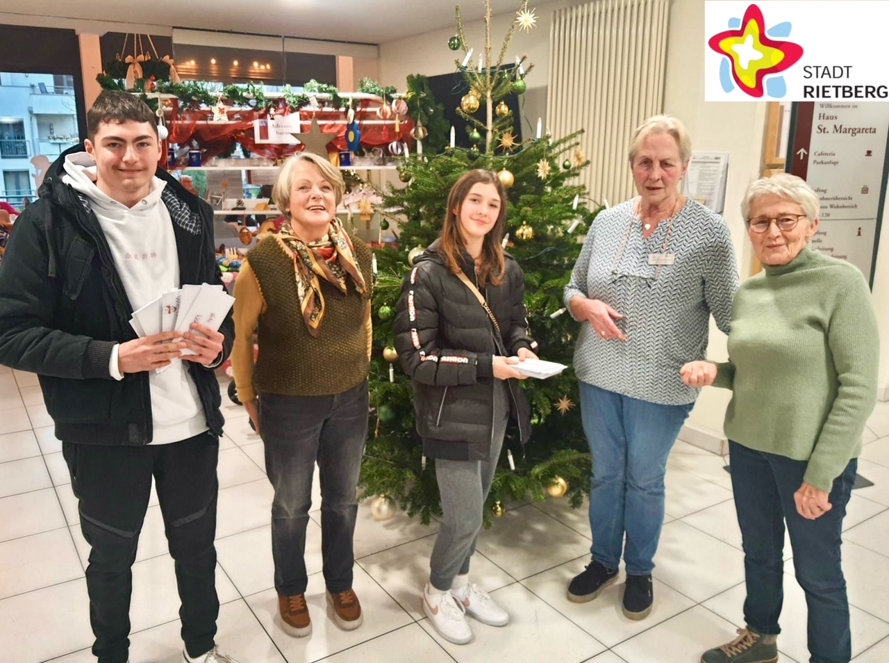 Ulrich Zimmer und Celine Schulz (Mitte) vom Jugendtreff Neuenkirchen überreichten zahlreiche von Neuenkirchener Kindern und Jugendlichen gebastelte Weihnachtskarten an Gertrud Röhrs, Elisabeth Dreisewerd und Ulli Buschsieweke (von links) vom Altenpflegeheim St. Margareta. Foto: Stadt Rietberg
