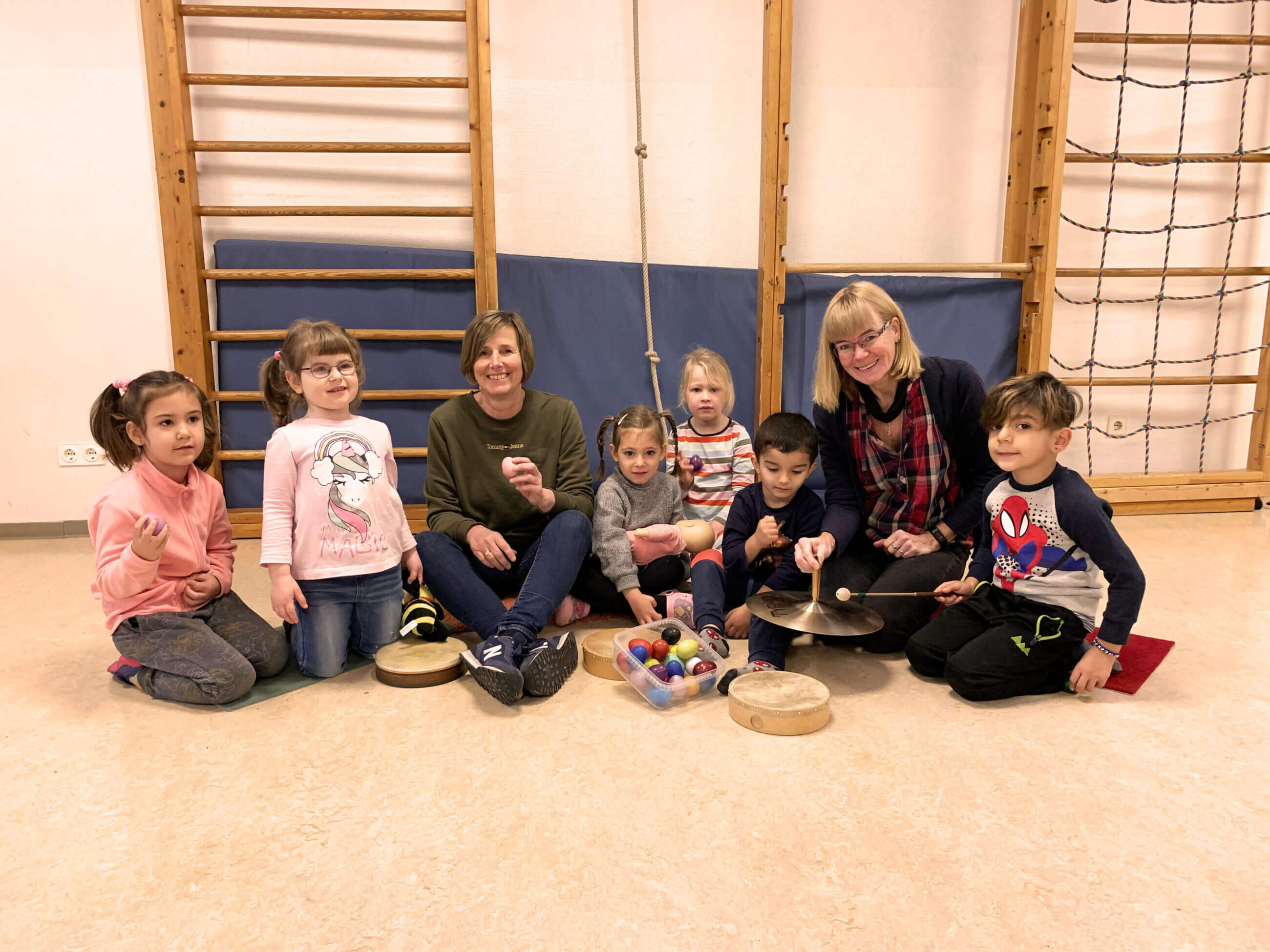 BU Gruppenfoto mit Kindern: Bunte Rassel-Eier, Schlagzeug-Becken und Trommel: Für (v.l.) Sabina, Emily, Sofia, Lotte, Lavand und Majesta gibt es im EMU-Musikkoffer viel zu entdecken und auszuprobieren. Ingeborg Vogt (rechts), Fachbereichsleitung „Elementares Musizieren“ der Musikschule für den Kreis Gütersloh e.V., begleitet die Kinder mit ihrer Fachexpertise und wird dabei unterstützt von Nicolette Nottbrock (links), Erzieherin in der Kita Teismannsweg. Foto: Stadt Gütersloh