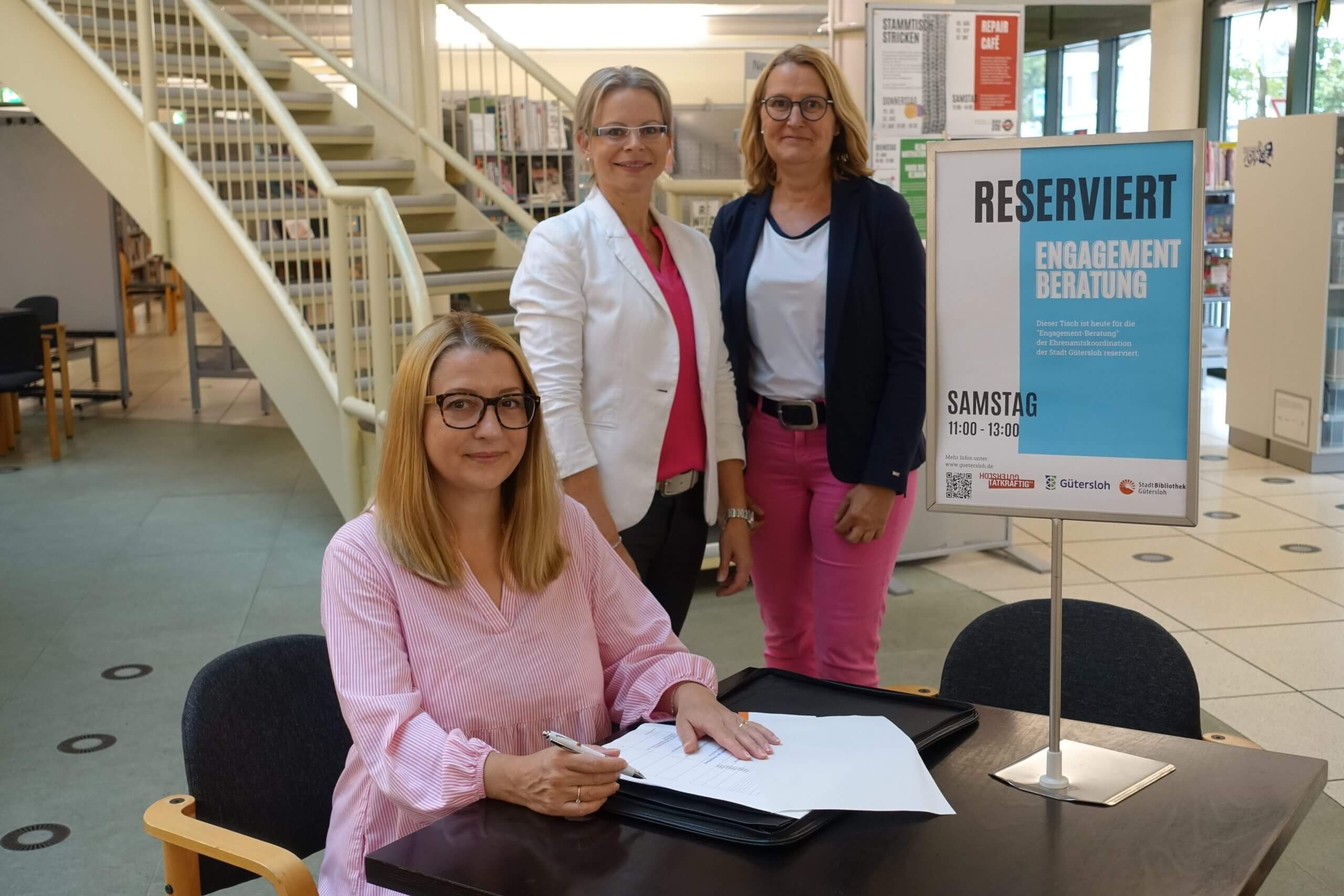Bildzeile: Inci Güdersoy-Dziallas ist die Ansprechpartnerin im Rahmen der Engagement-Beratung in der Stadtbibliothek Gütersloh. Sie startet am Samstag, 12. August, von 11-13 Uhr im Lesecafé. Ehrenamtskoordinatorin der Stadt Gütersloh, Elke Pauly-Teismann, und Silke Niermann, Geschäftsführerin der Stadtbibliothek Gütersloh, freuen sich über diesen ehrenamtlichen Einsatz und hoffen auf zahlreiche Interessierte (v. l.).