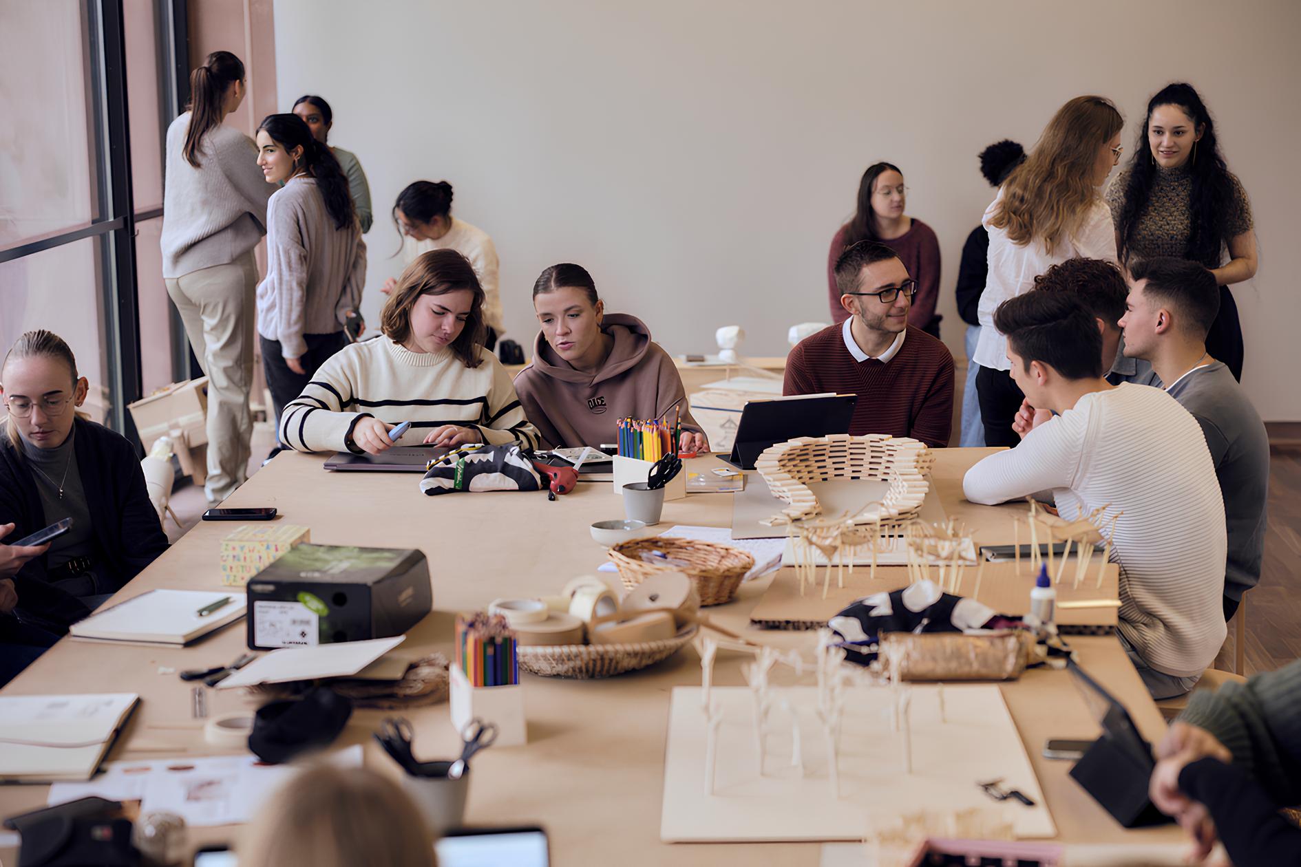 Leises Stimmengewirr ist zu hören. Um die Ecke der „Water Schools“ liegt die Werk-Insel, ein weiter Arbeitsraum mit durchgängiger Fensterfront zur Altstadt. In der Mitte ein großer Arbeitstisch, drum herum dicht an dicht Architektur-Studierende vom Campus Minden der HSBI: Fahrnschon hat die Ausstellung in einen „offenen Hörsaal“ verwandelt. Immer wieder schauen Museumsgäste vorbei. „Seminare in der Ausstellung sind ein zentraler Bestandteil der Kunst Tuazons. Er versteht Skulptur als Grundlage und als Forum, um kreative und gesellschaftliche Aktivitäten anzustoßen und zu fördern“, sagt der Kurator. Genau das richtige für ihre Studierenden im Modul Freies Gestalten, fand Prof. Dipl.-Ing. Bettina Georg, und nahm das Angebot zur Kooperation gerne an.