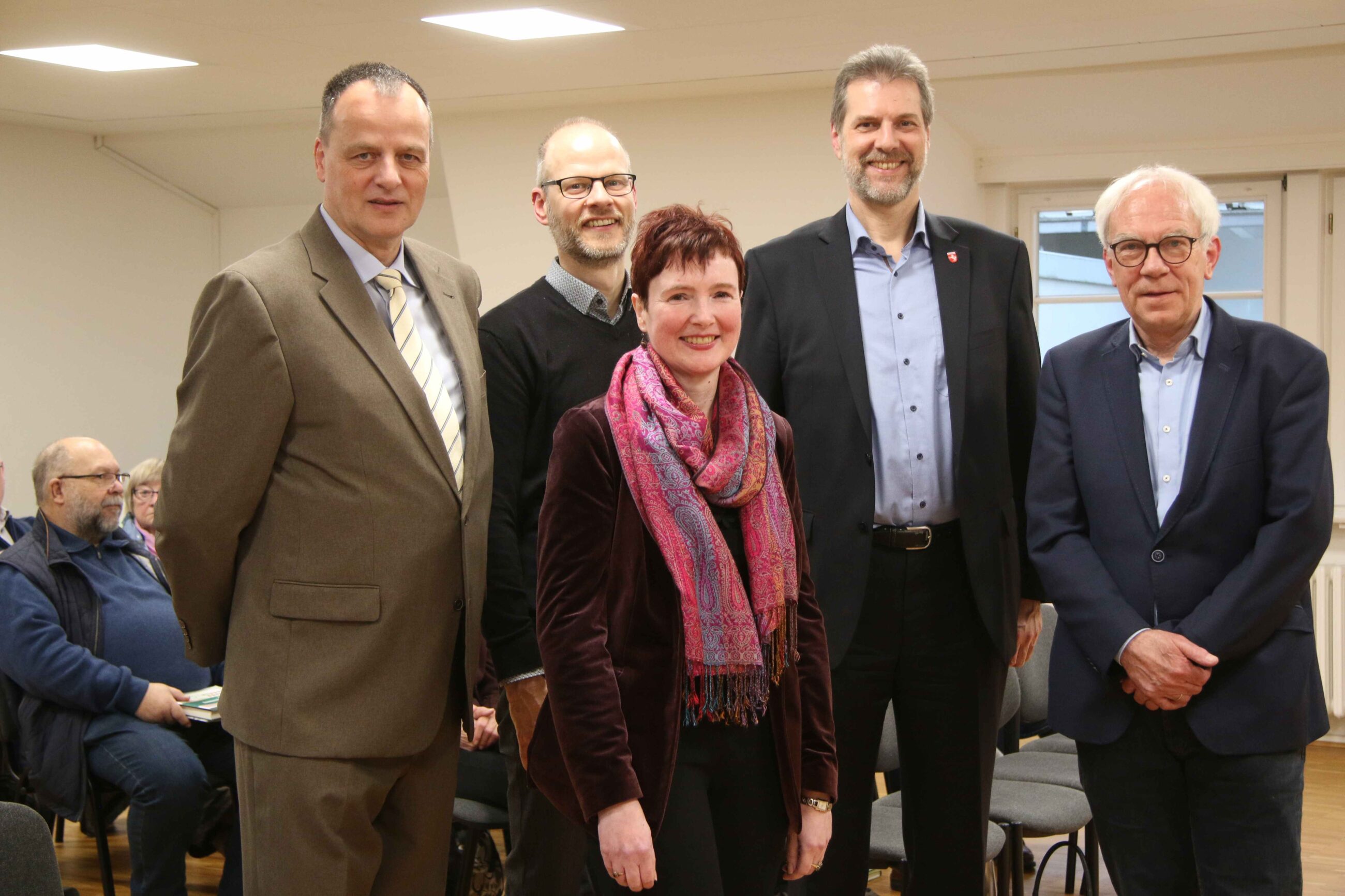 Auf der Wahlveranstaltung des Westfälischen Heimatbundes im Stadt- und Kreisarchiv Gütersloh (v.l.): Kreisheimatpfleger Michael Erichreineke, Kreisarchivar Ralf Othengrafen, Dr. Silke Eilers, Geschäftsführerin des Westfälischen Heimatbundes, Thorsten Schmolke, stellvertretender Landrat, und Kreisheimatpfleger Dr. Rolf Westheider. Foto: Kreis Gütersloh