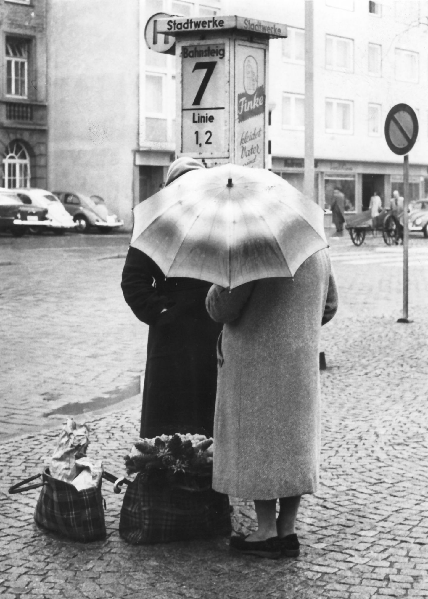 BU: „‘(Un)Sichtbare Frauen!?‘ ist das Thema des Erzählcafés am Montag, 4. März. Das Foto zeigt Frauen mit Einkaufstaschen an einer Bushaltestelle vor dem Gütersloher Bahnhof in der Kaiserstraße im Jahr 1960.“ Foto: Stadtarchiv Gütersloh.