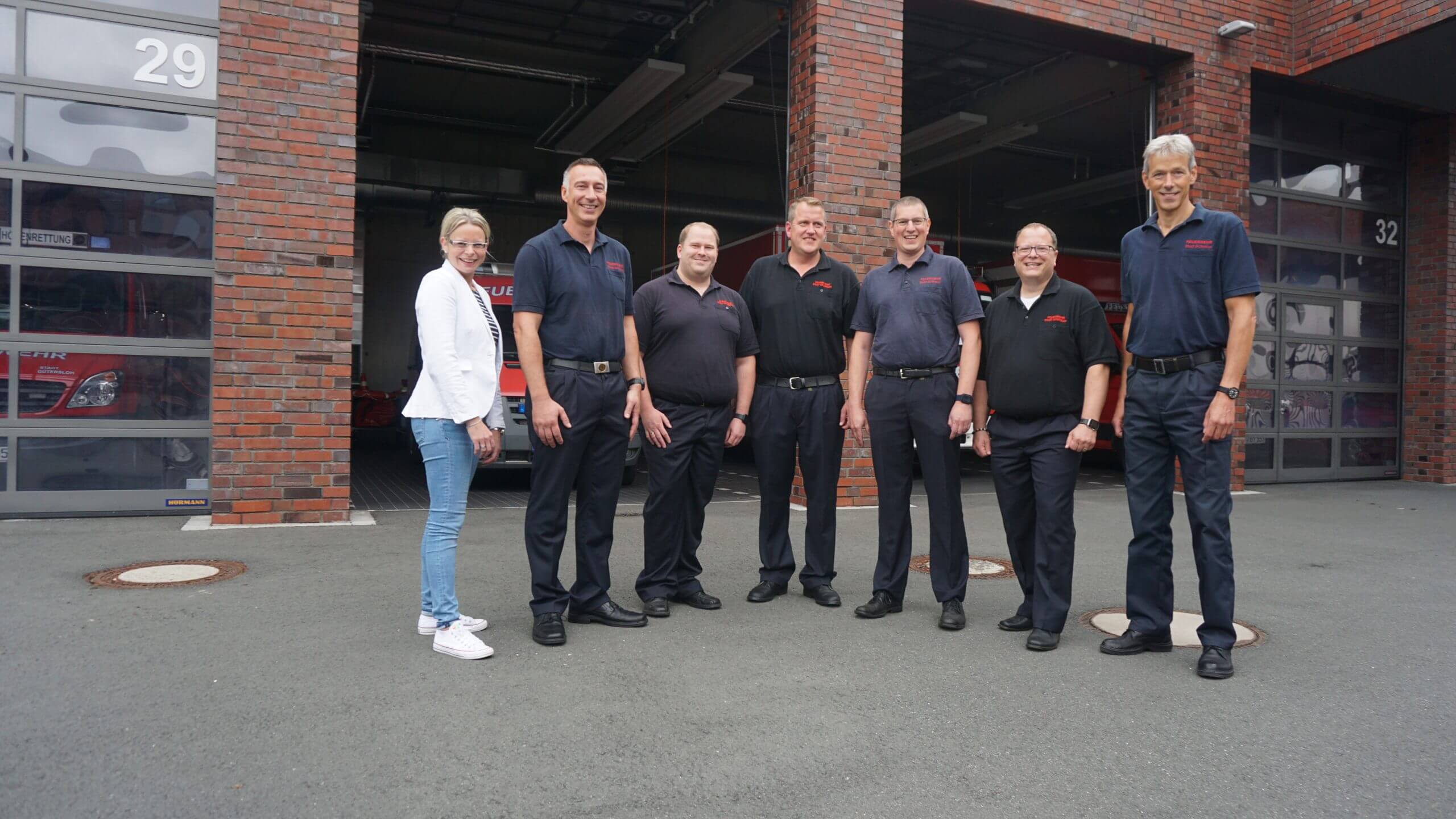 Bild: Suchen gemeinsam weitere Aktive für die Löschzüge der Freiwilligen Feuerwehr Gütersloh: (von links) Ehrenamts-Koordinatorin Elke Pauly-Teismann, Björn Zippert vom Löschzug Gütersloh, Titus Tobergte vom Löschzug Friedrichsdorf, Dennis Kiunke vom Löschzug Avenwedde, Marius Eickhoff vom Löschzug Spexard, Sven Schröder vom Löschzug Isselhorst und Hans-Joachim Koch, Leiter des Fachbereichs Feuerwehr bei der Stadt Gütersloh und Leiter der Gesamtfeuerwehr Gütersloh. Foto: Stadt Gütersloh.