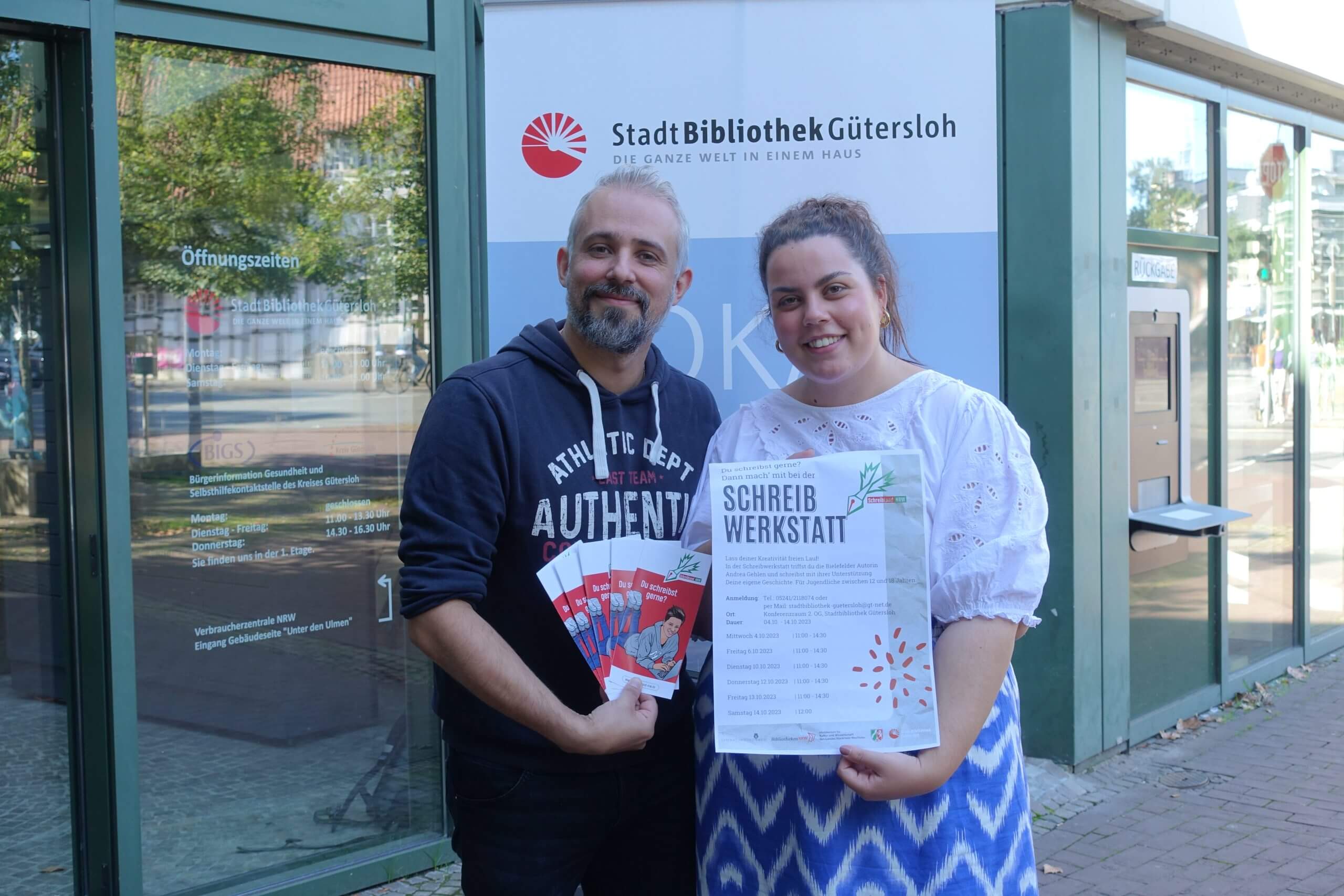 Kreatives Angebot in den Herbstferien: Michele Wegner, Teamleiter Programmarbeit/Veranstaltungen, und Kollegin Chantal Perez Romero, von der Stadtbibliothek Gütersloh, laden 10- bis 18-Jährige zur Schreibwerkstatt „Fundsachen“ ab 4. Oktober ein.