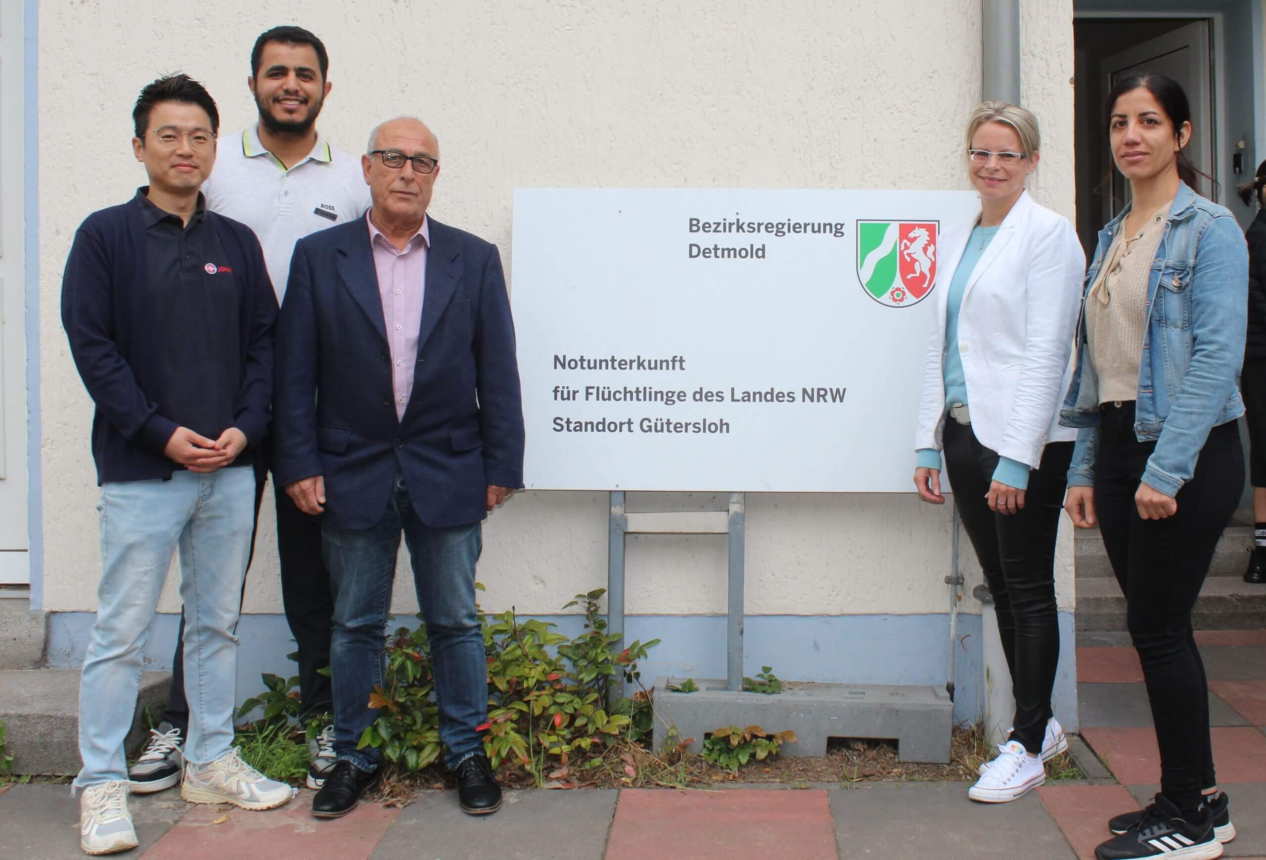 BU: (v.l.) Setzen sich ein und suchen Mitstreiterinnen und Mitstreiter: Jaewoo Lee (Johanniter), Mahmoud Farrag (Fachbereich Soziales), Asad Abu-Khurma (Leiter Landesunterkunft), Elke Pauly-Teismann (Ehrenamtskoordinatorin), Bayan Shibli (Fachbereich Soziales). Foto: Stadt Gütersloh