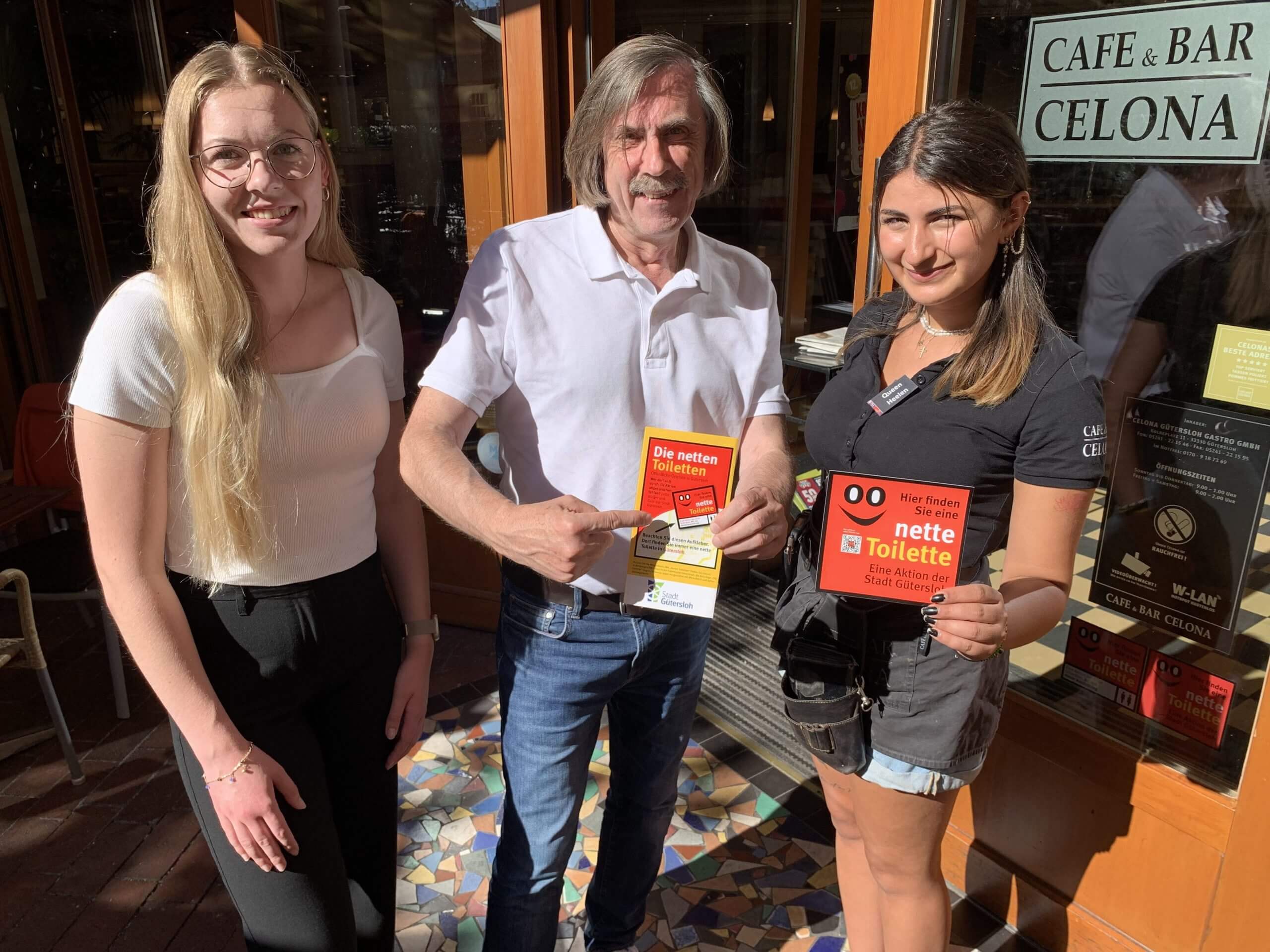 Setzen sich gemeinsam für die Idee der „Netten Toilette“ ein: Sarah Lienig (städtischer Fachbereich Ordnung), Bürgermeister Norbert Morkes und Helen Maroka vom teilnehmenden Lokal „Cafe und Bar Celona“. Foto: Stadt Gütersloh