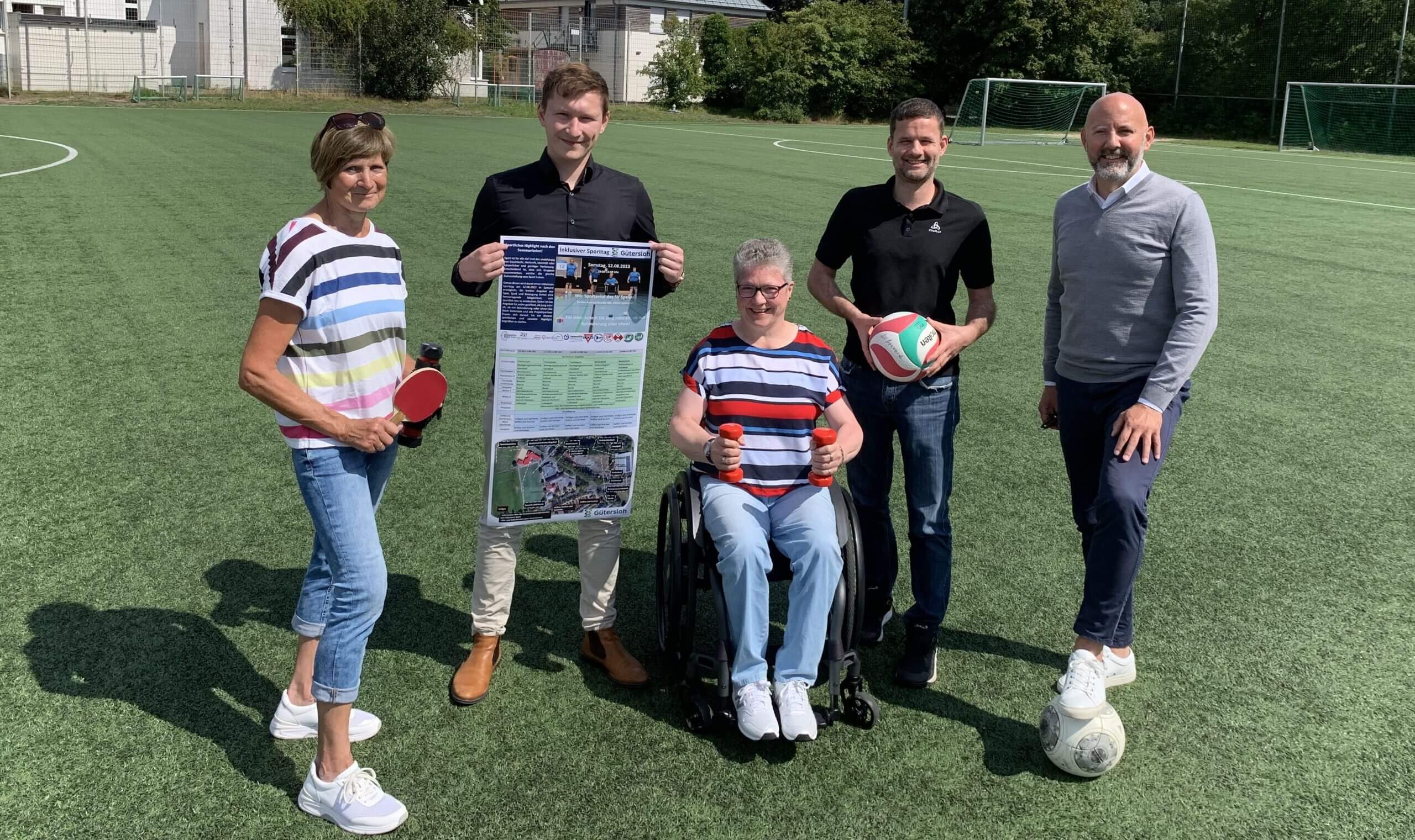 BU: Gisela Bauch vom SV Spexard, Thomas Piekorz vom Fachbereich Sport, Annette Runte vom Behindertenbeirat, Fachbereichsleiter Sport Heiko Gottwald sowie der Sportdezernent der Stadt Henning Matthessind schon voller Vorfreude auf den ersten inklusiven Sporttag in Gütersloh. Foto: Stadt Gütersloh