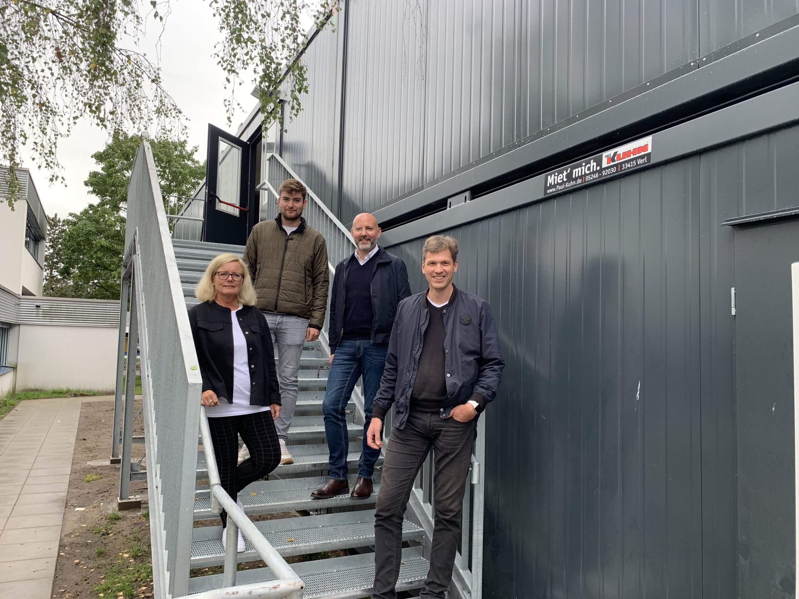 BU: Stehen auf dem Treppenaufgang der Container zum Obergeschoss, das die Verwaltung der Schule beherbergt: (v.l.) Tanja Ilic (Schulleiterin Grundschule Große Heide), Nicklas Blasche (Bauleiter/Architekturbüro Wischke und Send), Henning Matthes (Schuldezernent) und Eckhard Send (Architekt/Architekturbüro Wischke und Send). Foto: Stadt Gütersloh.