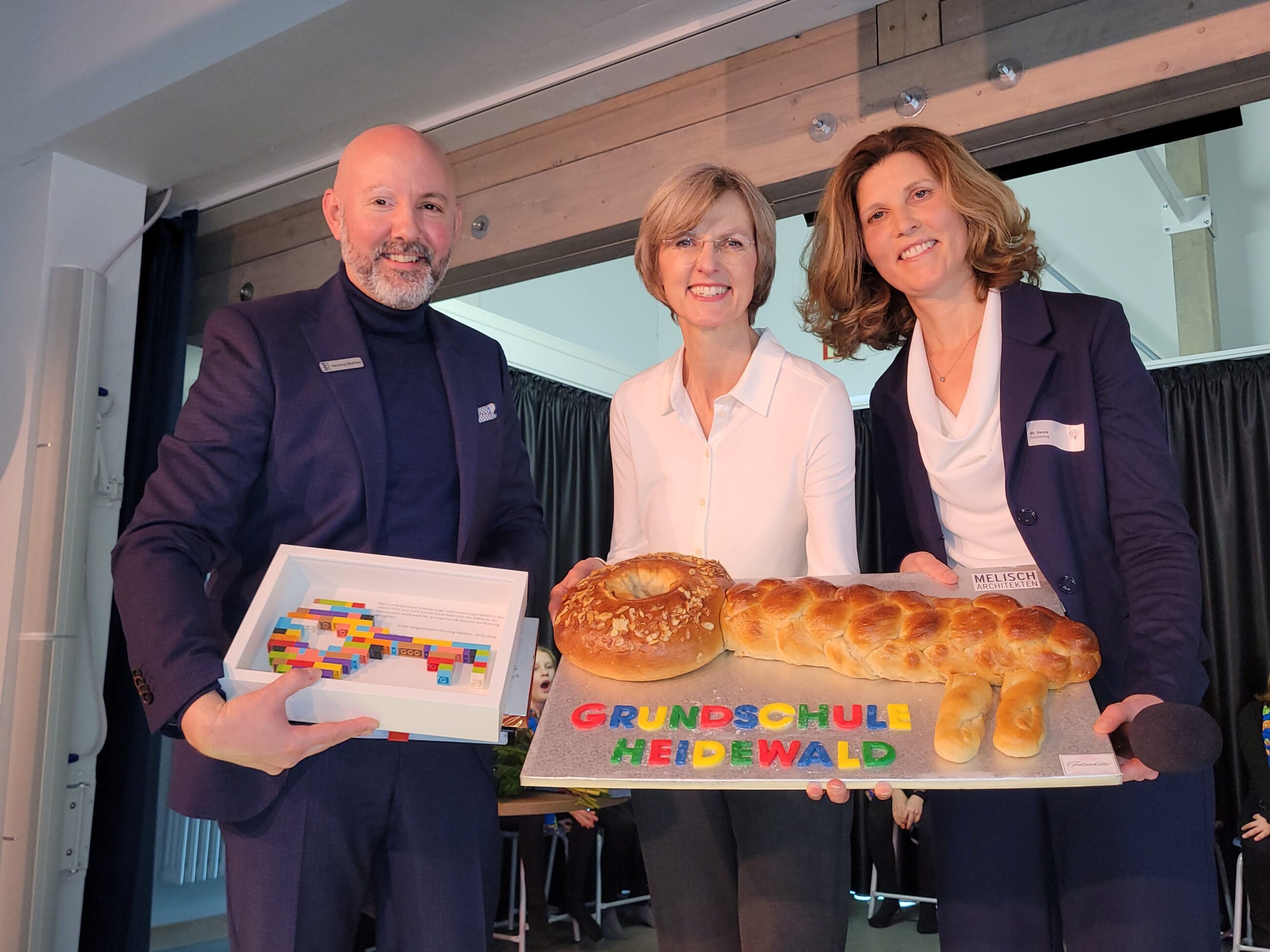 (v.l.) Der Beigeordnete der Stadt Gütersloh für den Bereich Schule, Henning Matthes, und die Architektin Birgit Melisch übergeben symbolisch sowohl einen Schlüssel aus Bausteinen als auch einen gebackenen Schlüssel an die Schulleiterin der Grundschule Heidewald Miriam Henze. Foto: Stadt Gütersloh