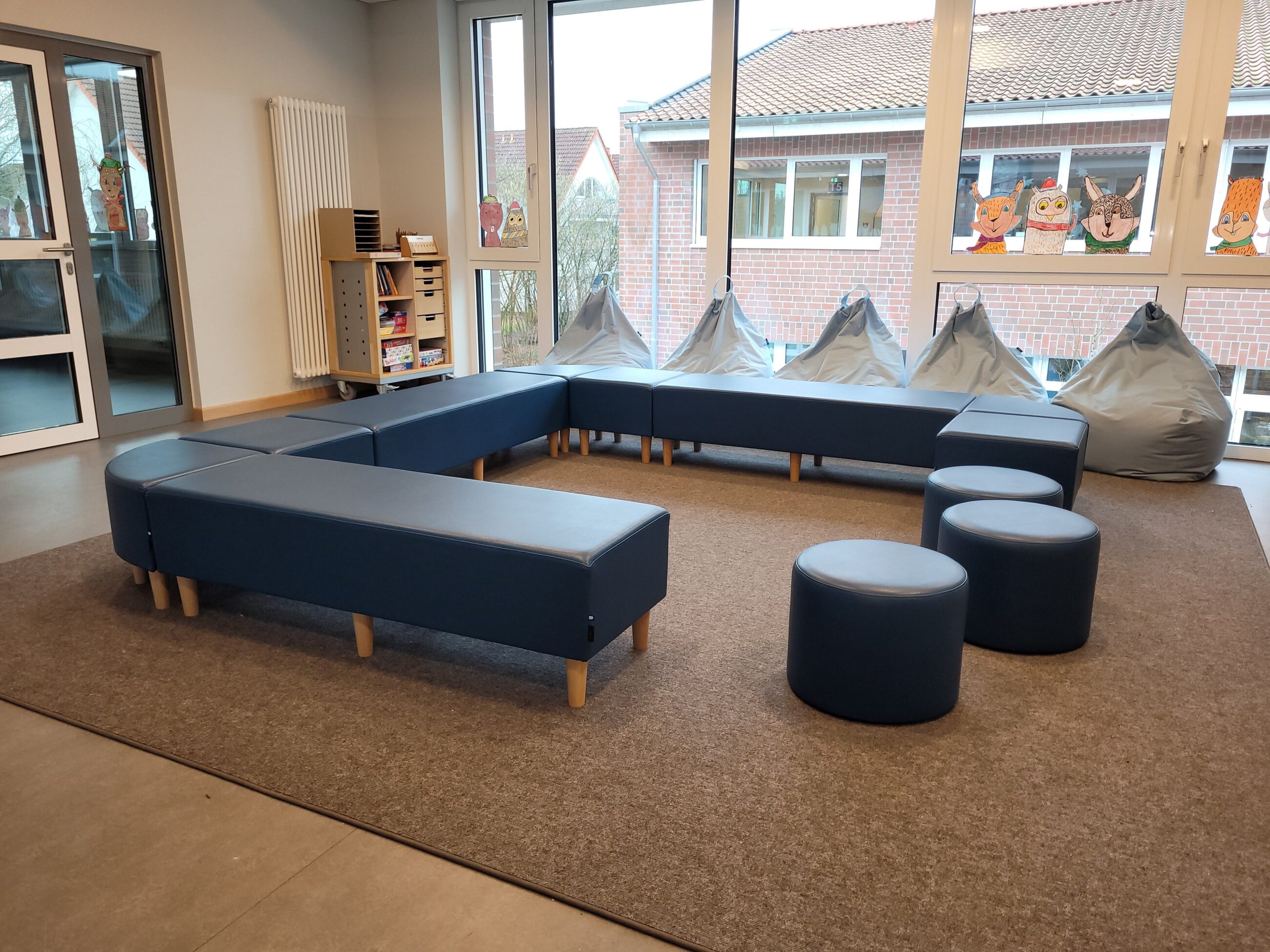 Die Räume der einzelnen Jahrgangsstufen sind als sogenannte Cluster angelegt, zu denen neben Klassen- und Differenzierungsräumen auch Flexzonen gehören. Die Ausstattung besteht beispielsweise aus Sitzsäcken, die von den Kindern gern genutzt werden. Foto: Stadt Gütersloh